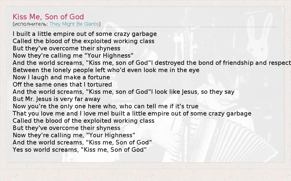 А как ты думаешь, о чем песня "Kiss Me, Son of God" ?