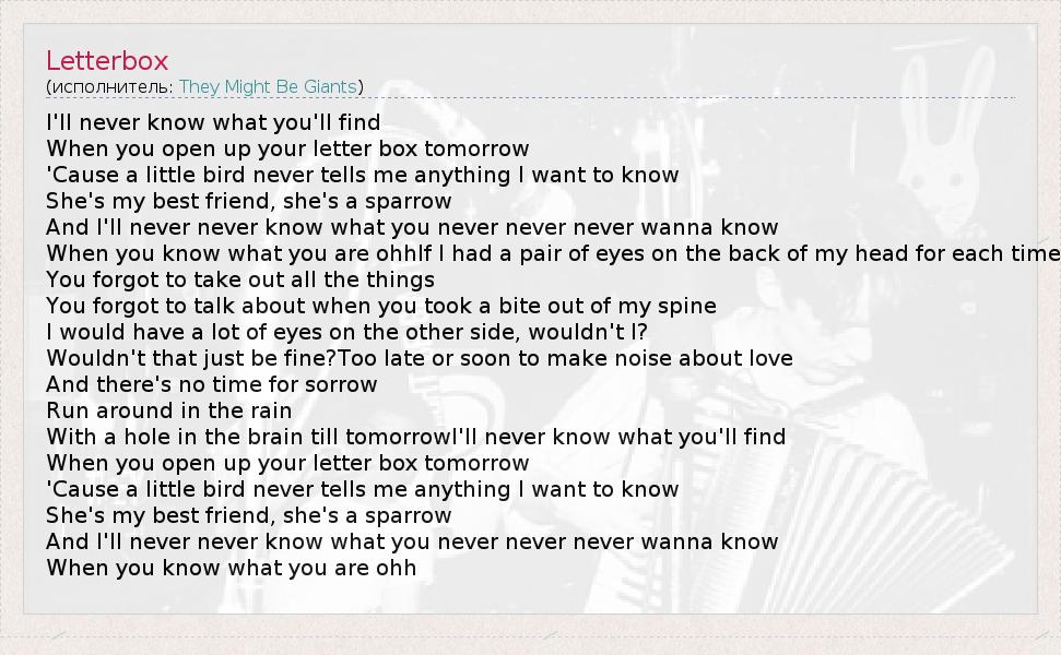 А как ты думаешь, о чем песня "Letterbox" ?