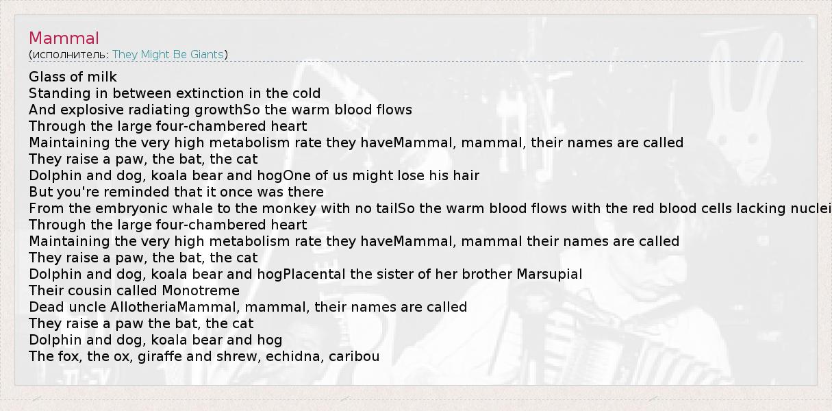 Это интересно:They Might Be Giants (обычно сокращают TMBG) - американская альтернативная рок-группа, которая началась как дуэт Джона Флэнсбёрга и Джона Линнелла, а в настоящее время также включает Марти Беллера, Дэна Миллера и Дэнни Вайнкауфа. Сформированная в 1982 году, группа прежде всего известна своим нетрадиционным и экспериментальным стилем альтернативной музыки. Группа получила известность на чартах modern... продолжение