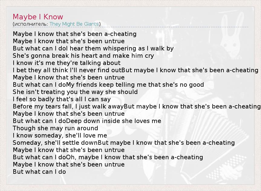 I bet they all think I'll never find outBut maybe I know that she's been a-cheating