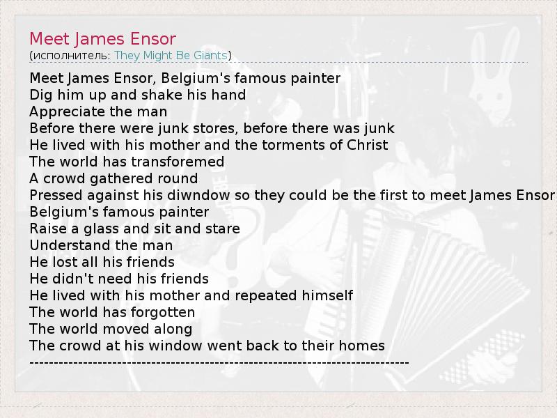 А как ты думаешь, о чем песня "Meet James Ensor" ?