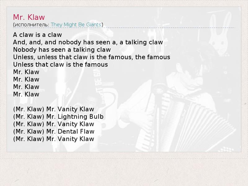 А как ты думаешь, о чем песня "Mr. Klaw" ?