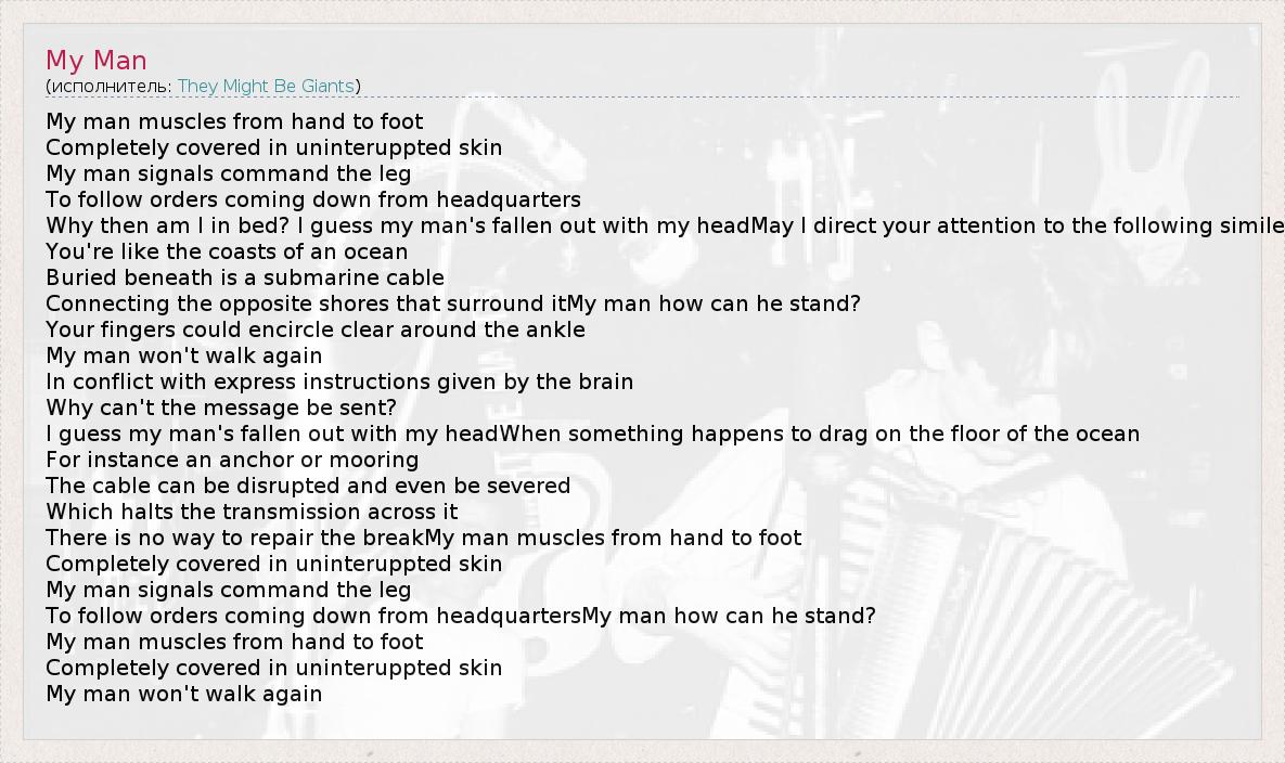 My man muscles from hand to foot Completely covered in uninteruppted skin My man signals command the leg To follow orders coming down from headquarters Why then am I in bed? I guess my man's fallen out with my headMay I direct your attention to the following simile You're like the coasts of an ocean Buried beneath is a submarine cable Connecting the opposite shores that surround itMy man how can he stand? Your fingers could encircle clear around the ankle My man won't walk again In conflict with express instructions given by the brain Why can't the message be sent? I guess my man's fallen out with my headWhen something happens to drag on the floor of the ocean For instance an anchor or mooring The cable can be disrupted and even be severed Which halts the transmission across it There is no way to repair the breakMy man muscles from hand to foot Completely covered in uninteruppted skin My man signals command the leg To follow orders coming down from headquartersMy man how can he stand? My man muscles from hand to foot Completely covered in uninteruppted skin My man won't walk again