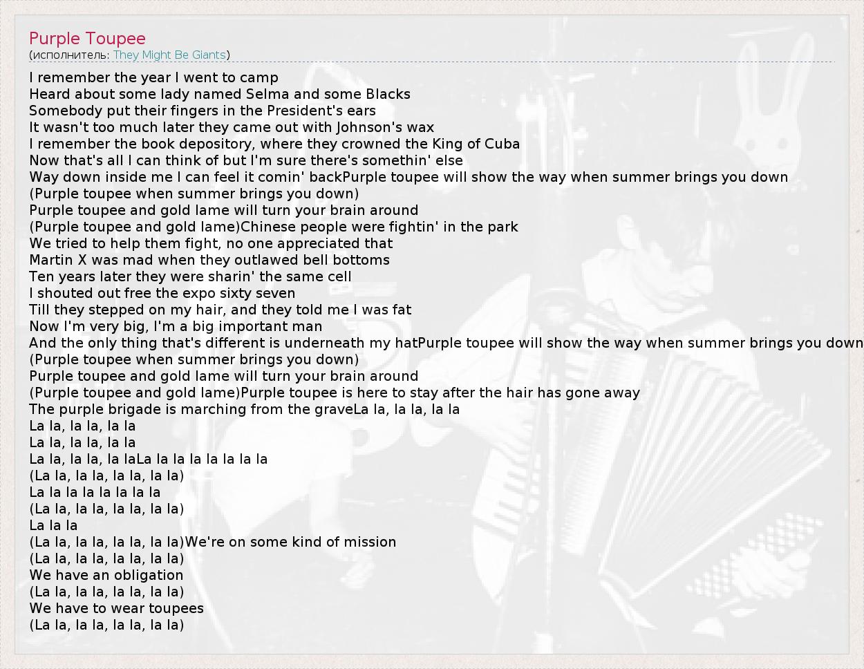 А как ты думаешь, о чем песня "Purple Toupee" ?