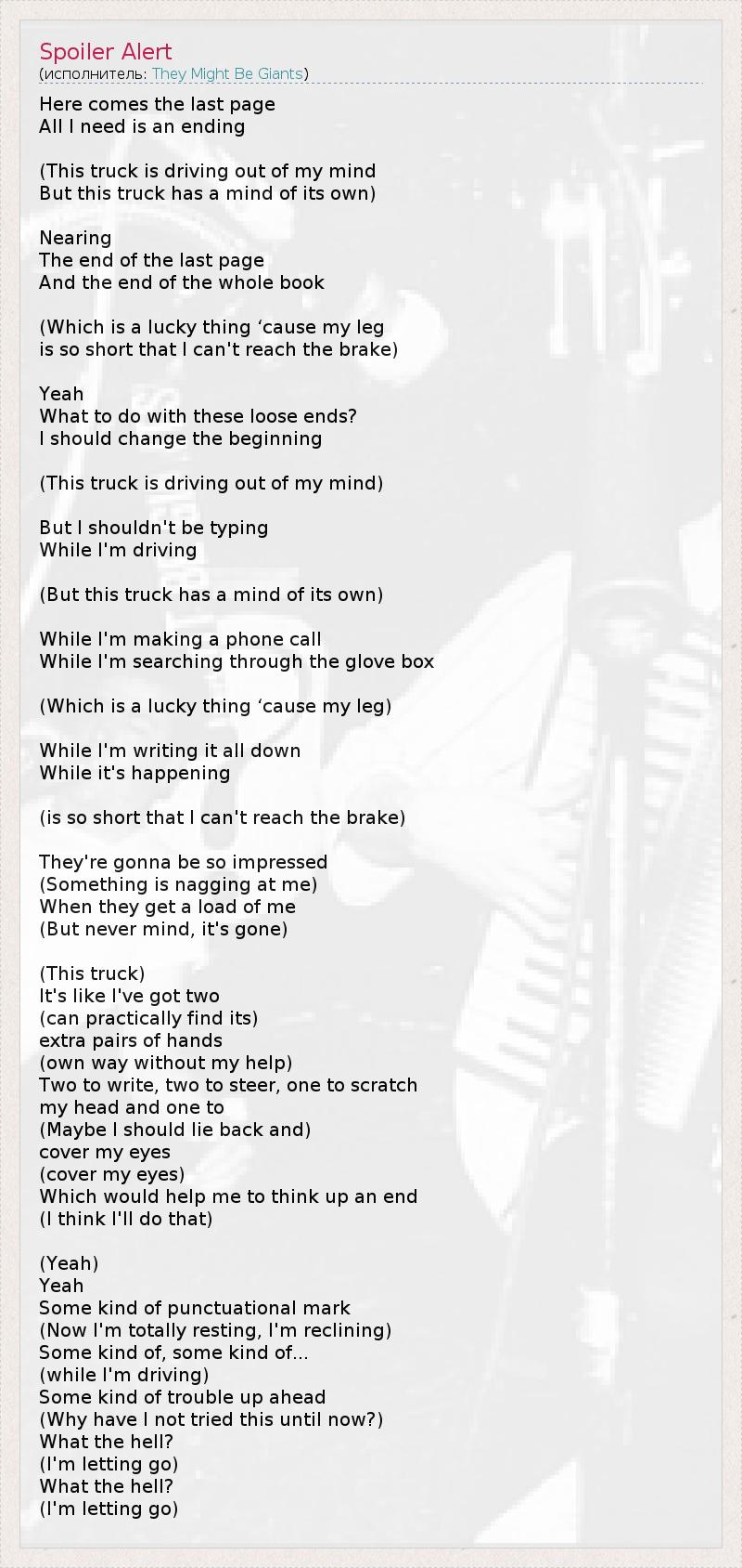 Вот и последняя страница, Осталось только придумать концовку. (Я теряю управление грузовиком, Но он прекрасно едет сам по себе.) Я приближаюсь К концу последней страницы И концу всей книги. (И это хорошо, поскольку мои ноги Коротковаты, чтобы достать до тормозов). Да! Так что же делать с концовкой? Изменю-ка я, пожалуй, начало, (Я теряю управление грузовиком,) Только не стоит, наверное, печатать, Пока я веду машину, (Но он прекрасно едет сам по себе,) Пока говорю по телефону, Пока роюсь в бардачке, (И это хорошо, поскольку мои ноги) Пока я записываю все это Между делом. (Коротковаты, чтобы достать до тормозов.) Они буду поражены, (Что-то беспокоит меня...) Когда получат целую пачку моей писанины. (Ну да ладно, все прошло.) (Этот грузовик) Как будто у меня появилось две (практически находит) Лишних пары рук - (дорогу без моей помощи.) Две руки, чтобы писать, две, чтобы вести, одна – Чесать голову и одна – (Может, мне стоит откинуться назад и) Прикрыть глаза, (прикрыть глаза -) Что поможет мне придумать концовку. (думаю, что так и сделаю.) Да! (Да!) Какой-нибудь подходящий знак препинания... (Теперь я откинулся на спинку и отдыхаю) Что-нибудь такое, такое... (во время езды.) Впереди на дороге что-то происходит... (Почему я не делал этого раньше?) Что за черт? (Я отпускаю руль...) Что за черт? (Я отпускаю руль...) * – Спойлер (варвар.) (от англ. «to spoil» – «портить») – преждевременно раскрытая важная информация, которая портит впечатление от игры/книги/фильма и разрушает их интригу.