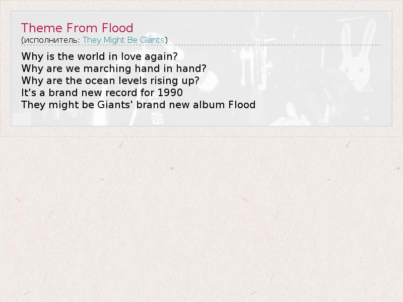 А как ты думаешь, о чем песня "Theme From Flood" ?