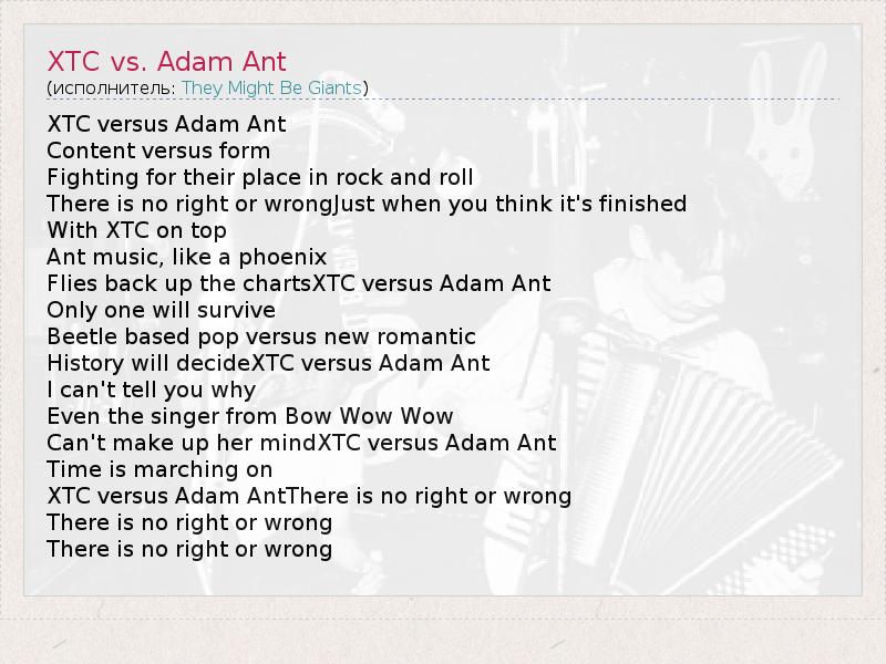 А как ты думаешь, о чем песня "XTC vs. Adam Ant" ?