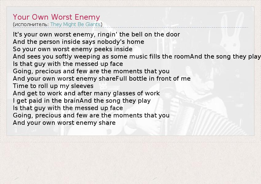 А как ты думаешь, о чем песня "Your Own Worst Enemy" ?