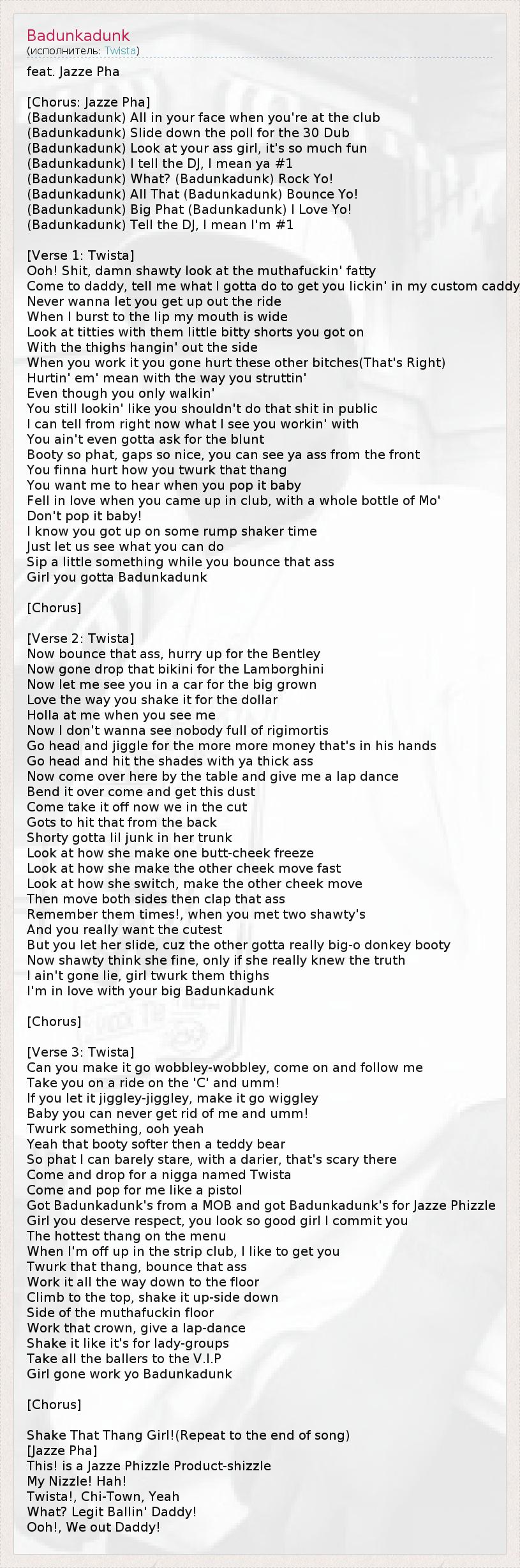 А как ты думаешь, о чем песня "Badunkadunk" ?
