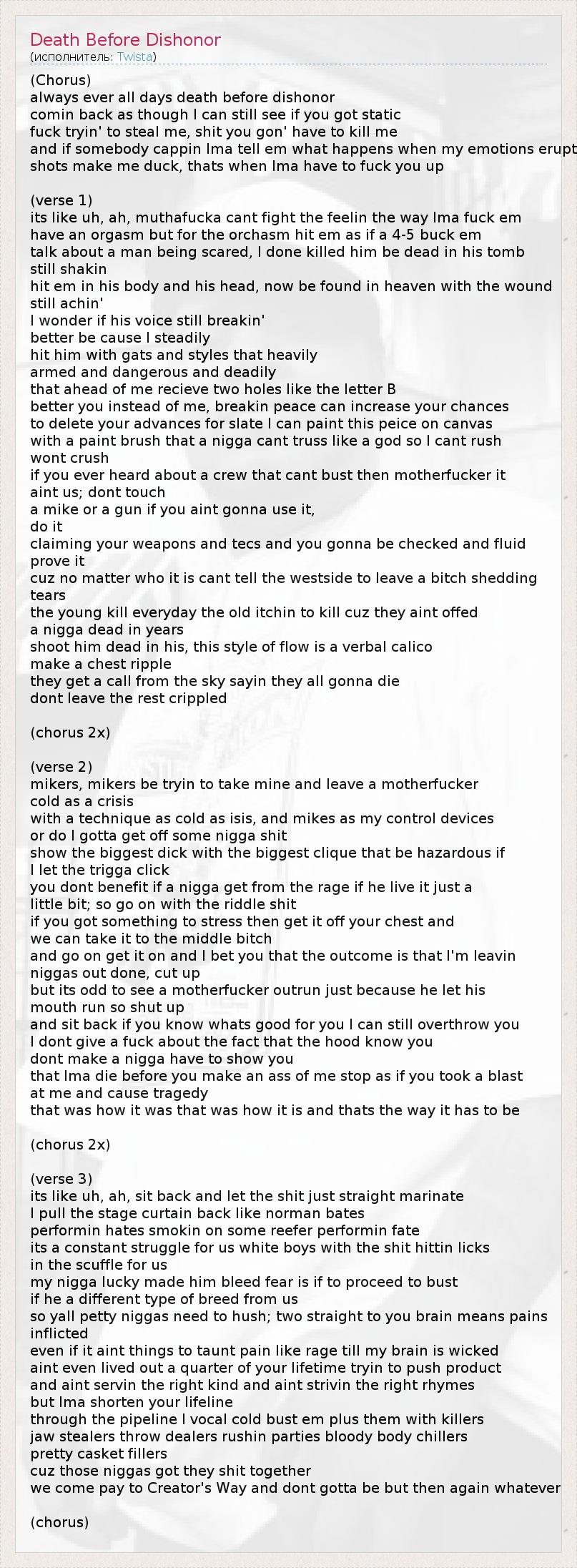 (Chorus) always ever all days death before dishonor comin back as though I can still see if you got static fuck tryin' to steal me, shit you gon' have to kill me and if somebody cappin Ima tell em what happens when my emotions erupt shots make me duck, thats when Ima have to fuck you up (verse 1) its like uh, ah, muthafucka cant fight the feelin the way Ima fuck em have an orgasm but for the orchasm hit em as if a 4-5 buck em talk about a man being scared, I done killed him be dead in his tomb still shakin hit em in his body and his head, now be found in heaven with the wound still achin' I wonder if his voice still breakin' better be cause I steadily hit him with gats and styles that heavily armed and dangerous and deadily that ahead of me recieve two holes like the letter B better you instead of me, breakin peace can increase your chances to delete your advances for slate I can paint this peice on canvas with a paint brush that a nigga cant truss like a god so I cant rush wont crush if you ever heard about a crew that cant bust then motherfucker it aint us; dont touch a mike or a gun if you aint gonna use it, do it claiming your weapons and tecs and you gonna be checked and fluid prove it cuz no matter who it is cant tell the westside to leave a bitch shedding tears the young kill everyday the old itchin to kill cuz they aint offed a nigga dead in years shoot him dead in his, this style of flow is a verbal calico make a chest ripple they get a call from the sky sayin they all gonna die dont leave the rest crippled (chorus 2x) (verse 2) mikers, mikers be tryin to take mine and leave a motherfucker cold as a crisis with a technique as cold as isis, and mikes as my control devices or do I gotta get off some nigga shit show the biggest dick with the biggest clique that be hazardous if I let the trigga click you dont benefit if a nigga get from the rage if he live it just a little bit; so go on with the riddle shit if you got something to stress then get it off your chest and we can take it to the middle bitch and go on get it on and I bet you that the outcome is that I'm leavin niggas out done, cut up but its odd to see a motherfucker outrun just because he let his mouth run so shut up and sit back if you know whats good for you I can still overthrow you I dont give a fuck about the fact that the hood know you dont make a nigga have to show you that Ima die before you make an ass of me stop as if you took a blast at me and cause tragedy that was how it was that was how it is and thats the way it has to be (chorus 2x) (verse 3) its like uh, ah, sit back and let the shit just straight marinate I pull the stage curtain back like norman bates performin hates smokin on some reefer performin fate its a constant struggle for us white boys with the shit hittin licks in the scuffle for us my nigga lucky made him bleed fear is if to proceed to bust if he a different type of breed from us so yall petty niggas need to hush; two straight to you brain means pains inflicted even if it aint things to taunt pain like rage till my brain is wicked aint even lived out a quarter of your lifetime tryin to push product and aint servin the right kind and aint strivin the right rhymes but Ima shorten your lifeline through the pipeline I vocal cold bust em plus them with killers jaw stealers throw dealers rushin parties bloody body chillers pretty casket fillers cuz those niggas got they shit together we come pay to Creator's Way and dont gotta be but then again whatever (chorus)