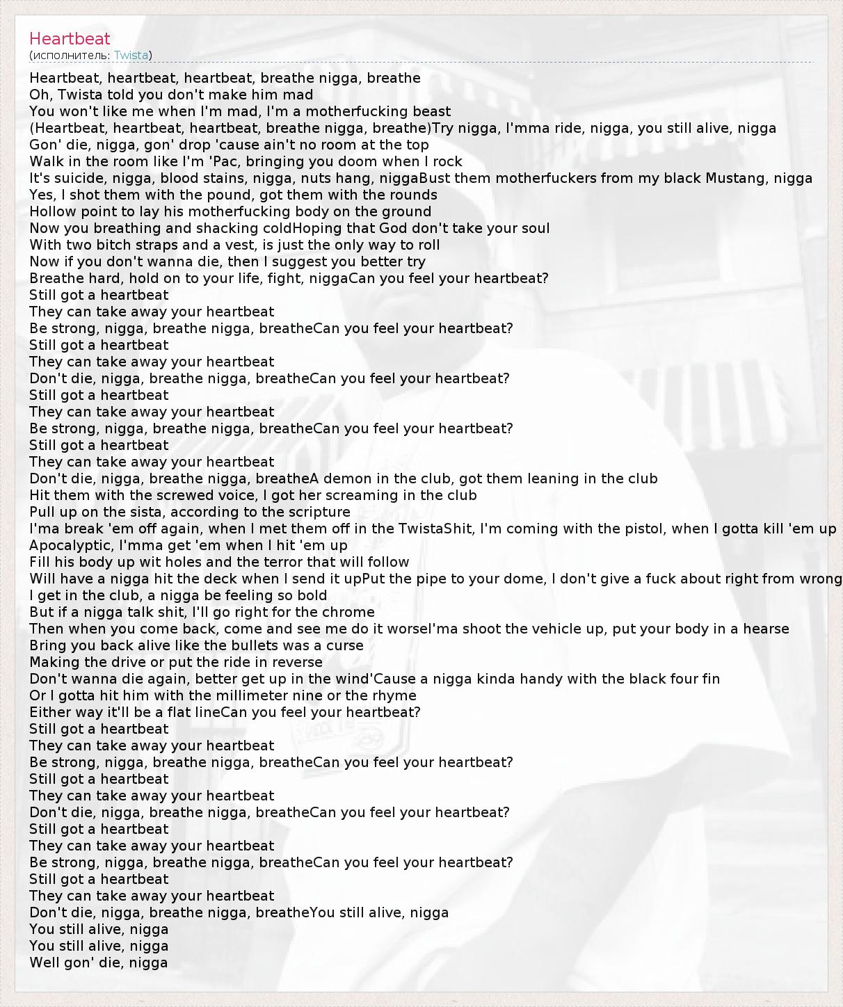 (Heartbeat, heartbeat, heartbeat, breathe nigga, breathe)Try nigga, I'mma ride, nigga, you still alive, nigga