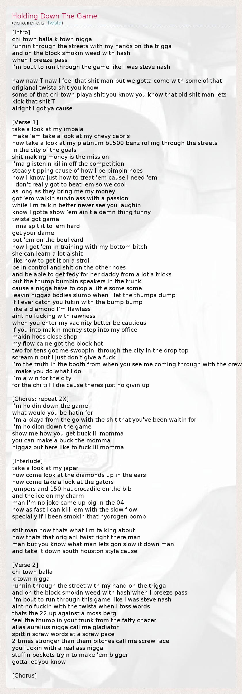[Intro] chi town balla k town nigga runnin through the streets with my hands on the trigga and on the block smokin weed with hash when I breeze pass I'm bout to run through the game like I was steve nash naw naw T naw I feel that shit man but we gotta come with some of that origianal twista shit you know some of that chi town playa shit you know you know that old shit man lets kick that shit T alright I got ya cause [Verse 1] take a look at my impala make 'em take a look at my chevy capris now take a look at my platinum bu500 benz rolling through the streets in the city of the goals shit making money is the mission I'ma glistenin killin off the competition steady tipping cause of how I be pimpin hoes now I know just how to treat 'em cause I need 'em I don't really got to beat 'em so we cool as long as they bring me my money got 'em walkin survin ass with a passion while I'm talkin better never see you laughin know I gotta show 'em ain't a damn thing funny twista got game finna spit it to 'em hard get your dame put 'em on the boulivard now I got 'em in training with my bottom bitch she can learn a lot a shit like how to get it on a stroll be in control and shit on the other hoes and be able to get fedy for her daddy from a lot a tricks but the thump bumpin speakers in the trunk cause a nigga have to cop a little some some leavin niggaz bodies slump when I let the thumpa dump if I ever catch you fukin with the bump bump like a diamond I'm flawless aint no fucking with rawness when you enter my vacinity better be cautious if you into makin money step into my office makin hoes close shop my flow caine got the block hot two for tens got me swoopin' through the city in the drop top screamin out I just don't give a fuck I'm the truth in the booth from when you see me coming through with the crew I make you do what I do I'm a win for the city for the chi till I die cause theres just no givin up [Chorus: repeat 2X] I'm holdin down the game what would you be hatin for I'm a playa from the go with the shit that you've been waitin for I'm holdion down the game show me how you get buck lil momma you can make a buck the momma niggaz out here like to fuck lil momma [Interlude] take a look at my japer now come look at the diamonds up in the ears now come take a look at the gators jumpers and 150 hat crocadile on the bib and the ice on my charm man I'm no joke came up big in the 04 now as fast I can kill 'em with the slow flow specially if I been smokin that hydrogen bomb shit man now thats what I'm talking about now thats that origianl twist right there man man but you know what man lets gon slow it down man and take it down south houston style cause [Verse 2] chi town balla k town nigga runnin through the street with my hand on the trigga and on the block smokin weed with hash when I breeze pass I'm bout to run through this game like I was steve nash aint no fuckin with the twista when I toss words thats the 22 up against a moss berg feel the thump in your trunk from the fatty chacer alias auralius nigga call me gladiator spittin screw words at a screw pace 2 times stronger than them bitches call me screw face you fuckin with a real ass nigga stuffin pockets tryin to make 'em bigger gotta let you know [Chorus]