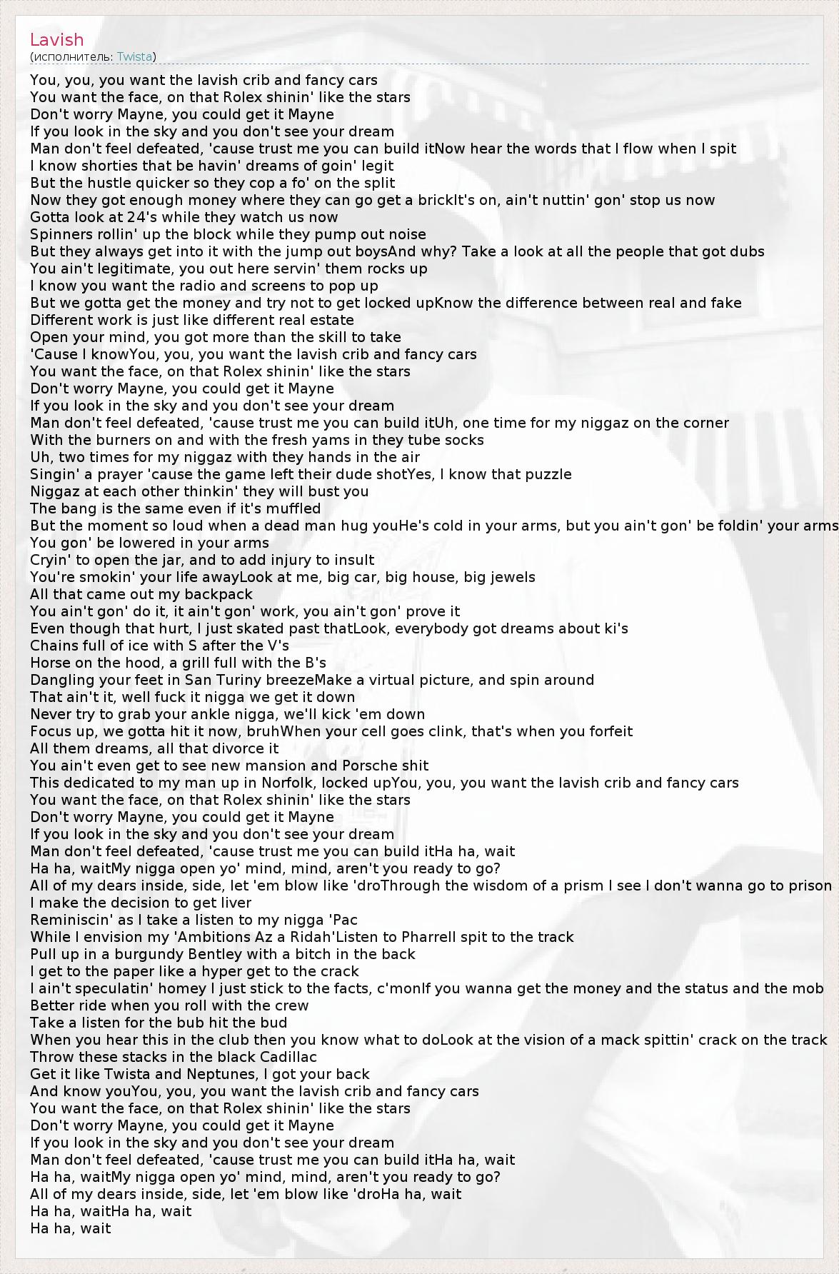 You, you, you want the lavish crib and fancy cars You want the face, on that Rolex shinin' like the stars Don't worry Mayne, you could get it Mayne If you look in the sky and you don't see your dream Man don't feel defeated, 'cause trust me you can build itNow hear the words that I flow when I spit I know shorties that be havin' dreams of goin' legit But the hustle quicker so they cop a fo' on the split Now they got enough money where they can go get a brickIt's on, ain't nuttin' gon' stop us now Gotta look at 24's while they watch us now Spinners rollin' up the block while they pump out noise But they always get into it with the jump out boysAnd why? Take a look at all the people that got dubs You ain't legitimate, you out here servin' them rocks up I know you want the radio and screens to pop up But we gotta get the money and try not to get locked upKnow the difference between real and fake Different work is just like different real estate Open your mind, you got more than the skill to take 'Cause I knowYou, you, you want the lavish crib and fancy cars You want the face, on that Rolex shinin' like the stars Don't worry Mayne, you could get it Mayne If you look in the sky and you don't see your dream Man don't feel defeated, 'cause trust me you can build itUh, one time for my niggaz on the corner With the burners on and with the fresh yams in they tube socks Uh, two times for my niggaz with they hands in the air Singin' a prayer 'cause the game left their dude shotYes, I know that puzzle Niggaz at each other thinkin' they will bust you The bang is the same even if it's muffled But the moment so loud when a dead man hug youHe's cold in your arms, but you ain't gon' be foldin' your arms You gon' be lowered in your arms Cryin' to open the jar, and to add injury to insult You're smokin' your life awayLook at me, big car, big house, big jewels All that came out my backpack You ain't gon' do it, it ain't gon' work, you ain't gon' prove it Even though that hurt, I just skated past thatLook, everybody got dreams about ki's Chains full of ice with S after the V's Horse on the hood, a grill full with the B's Dangling your feet in San Turiny breezeMake a virtual picture, and spin around That ain't it, well fuck it nigga we get it down Never try to grab your ankle nigga, we'll kick 'em down Focus up, we gotta hit it now, bruhWhen your cell goes clink, that's when you forfeit All them dreams, all that divorce it You ain't even get to see new mansion and Porsche shit This dedicated to my man up in Norfolk, locked upYou, you, you want the lavish crib and fancy cars You want the face, on that Rolex shinin' like the stars Don't worry Mayne, you could get it Mayne If you look in the sky and you don't see your dream Man don't feel defeated, 'cause trust me you can build itHa ha, wait Ha ha, waitMy nigga open yo' mind, mind, aren't you ready to go? All of my dears inside, side, let 'em blow like 'droThrough the wisdom of a prism I see I don't wanna go to prison I make the decision to get liver Reminiscin' as I take a listen to my nigga 'Pac While I envision my 'Ambitions Az a Ridah'Listen to Pharrell spit to the track Pull up in a burgundy Bentley with a bitch in the back I get to the paper like a hyper get to the crack I ain't speculatin' homey I just stick to the facts, c'monIf you wanna get the money and the status and the mob Better ride when you roll with the crew Take a listen for the bub hit the bud When you hear this in the club then you know what to doLook at the vision of a mack spittin' crack on the track Throw these stacks in the black Cadillac Get it like Twista and Neptunes, I got your back And know youYou, you, you want the lavish crib and fancy cars You want the face, on that Rolex shinin' like the stars Don't worry Mayne, you could get it Mayne If you look in the sky and you don't see your dream Man don't feel defeated, 'cause trust me you can build itHa ha, wait Ha ha, waitMy nigga open yo' mind, mind, aren't you ready to go? All of my dears inside, side, let 'em blow like 'droHa ha, wait Ha ha, waitHa ha, wait Ha ha, wait