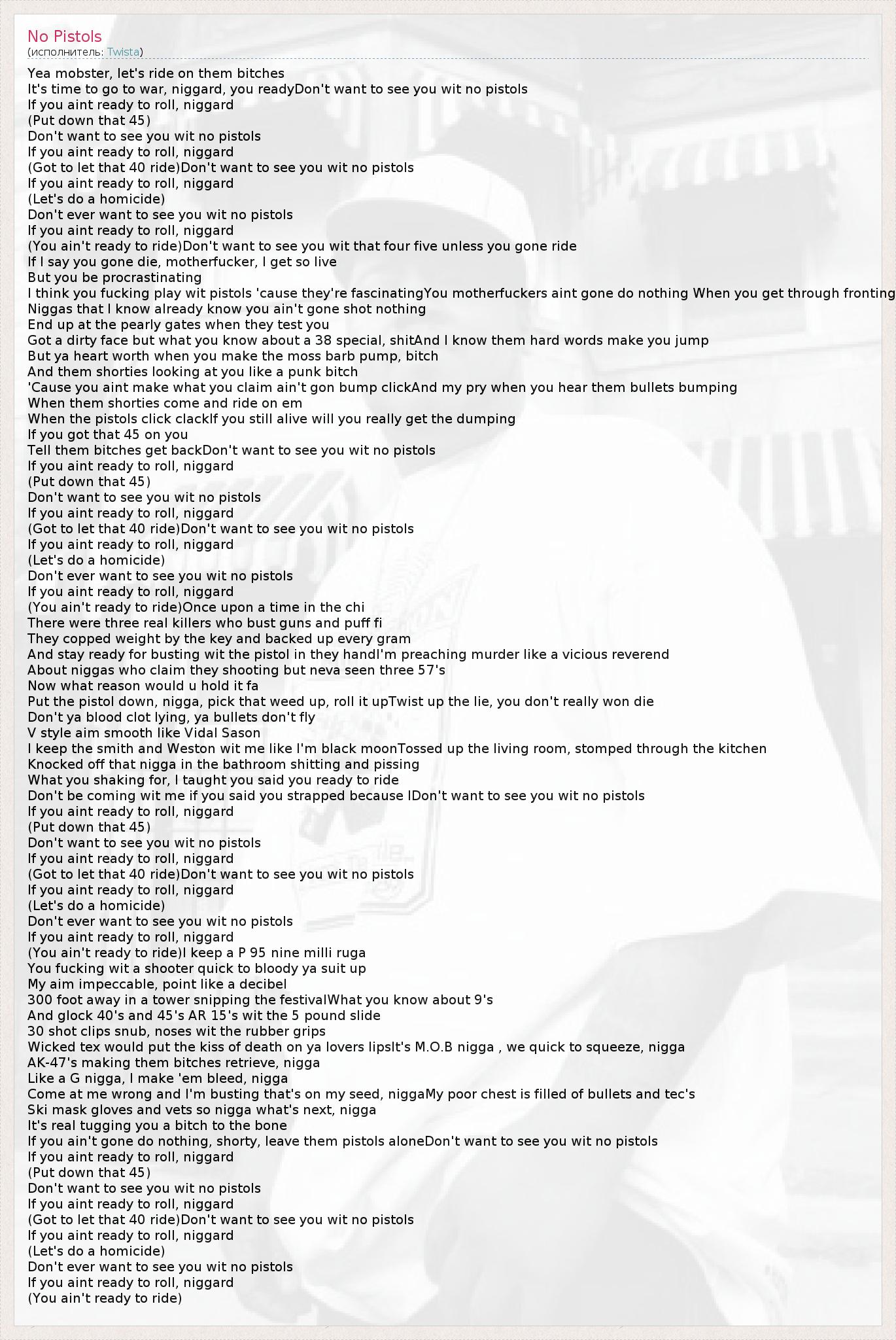 It's time to go to war, niggard, you readyDon't want to see you wit no pistols