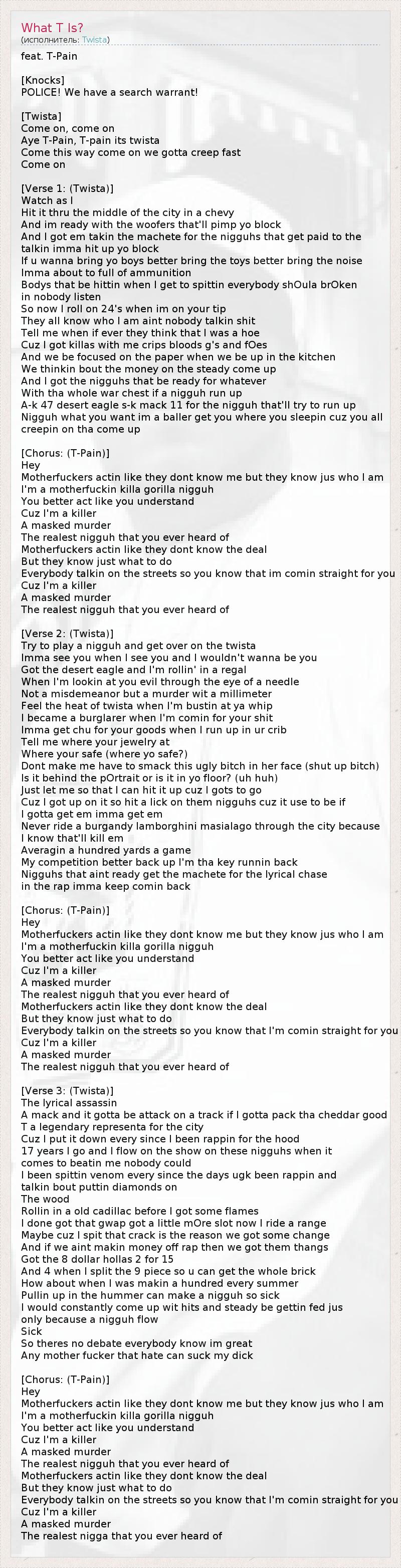 And I got em takin the machete for the nigguhs that get paid to the