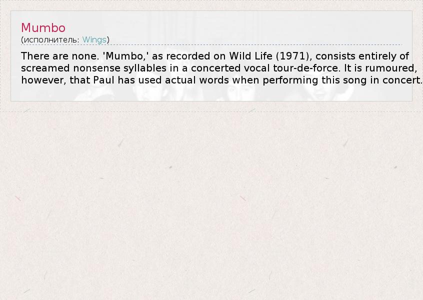 There are none. 'Mumbo,' as recorded on Wild Life (1971), consists entirely of
