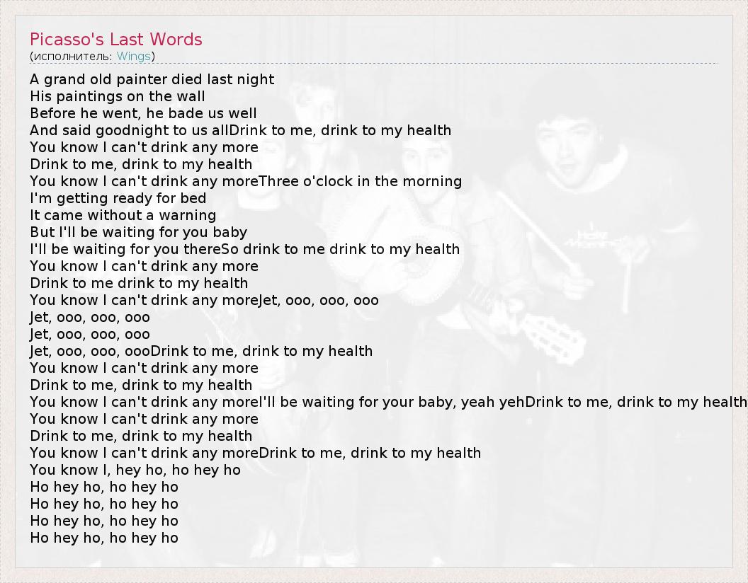 На вечеринке с Дастином Хофманом в Нигерии, где тот снимался в фильме "Мотылёк", а Маккартни записывал альбом, актёр заинтересовался, как создаются песни и рассказал, что недавно умер Пабло Пикассо. Это случилось в 3 часа утра, когда он ушёл спать, и прощаясь с друзьями, произнёс слова, ставшие пророческими: "Выпейте за меня, я больше пить не смогу". Маккартни тут же взял гитару и стал наигрывать песню. Дастин Хофман был поражён.