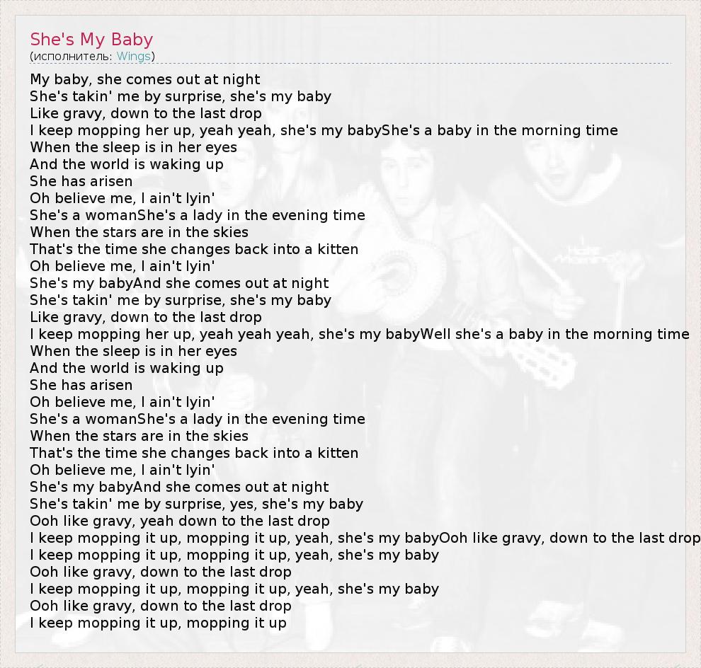 I keep mopping her up, yeah yeah yeah, she's my babyWell she's a baby in the morning time