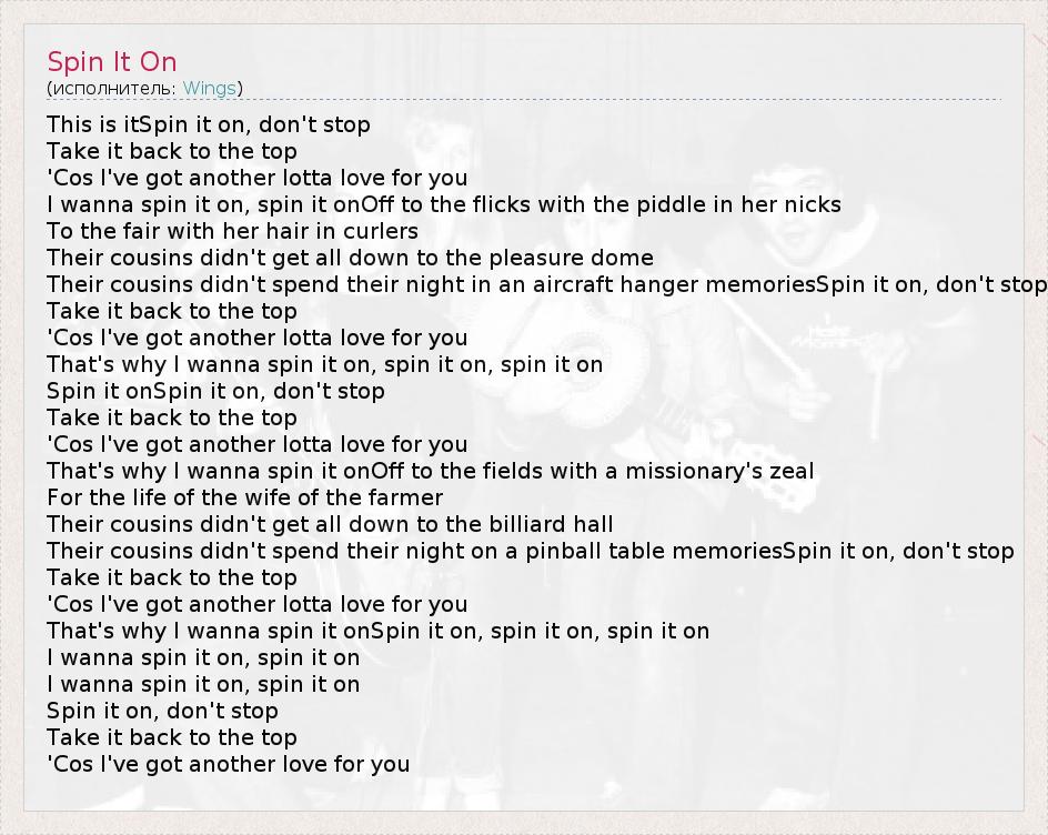 I wanna spin it on, spin it onOff to the flicks with the piddle in her nicks