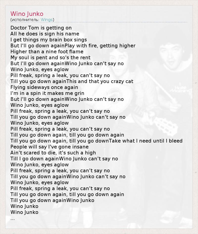 Doctor Tom is getting on All he does is sign his name I get things my brain box sings But I'll go down againPlay with fire, getting higher Higher than a nine foot flame My soul is pent and so's the rent But I'll go down againWino Junko can't say no Wino Junko, eyes aglow Pill freak, spring a leak, you can't say no Till you go down againThis and that you crazy cat Flying sideways once again I'm in a spin it makes me grin But I'll go down againWino Junko can't say no Wino Junko, eyes aglow Pill freak, spring a leak, you can't say no Till you go down againWino Junko can't say no Wino Junko, eyes aglow Pill freak, spring a leak, you can't say no Till you go down again, till you go down again Till you go down again, till you go downTake what I need until I bleed People will say I've gone insane Ain't scared to die, it's such a high Till I go down againWino Junko can't say no Wino Junko, eyes aglow Pill freak, spring a leak, you can't say no Till you go down againWino Junko can't say no Wino Junko, eyes aglow Pill freak, spring a leak, you can't say no Till you go down again, till you go down again Till you go down againWino Junko Wino Junko Wino Junko ...