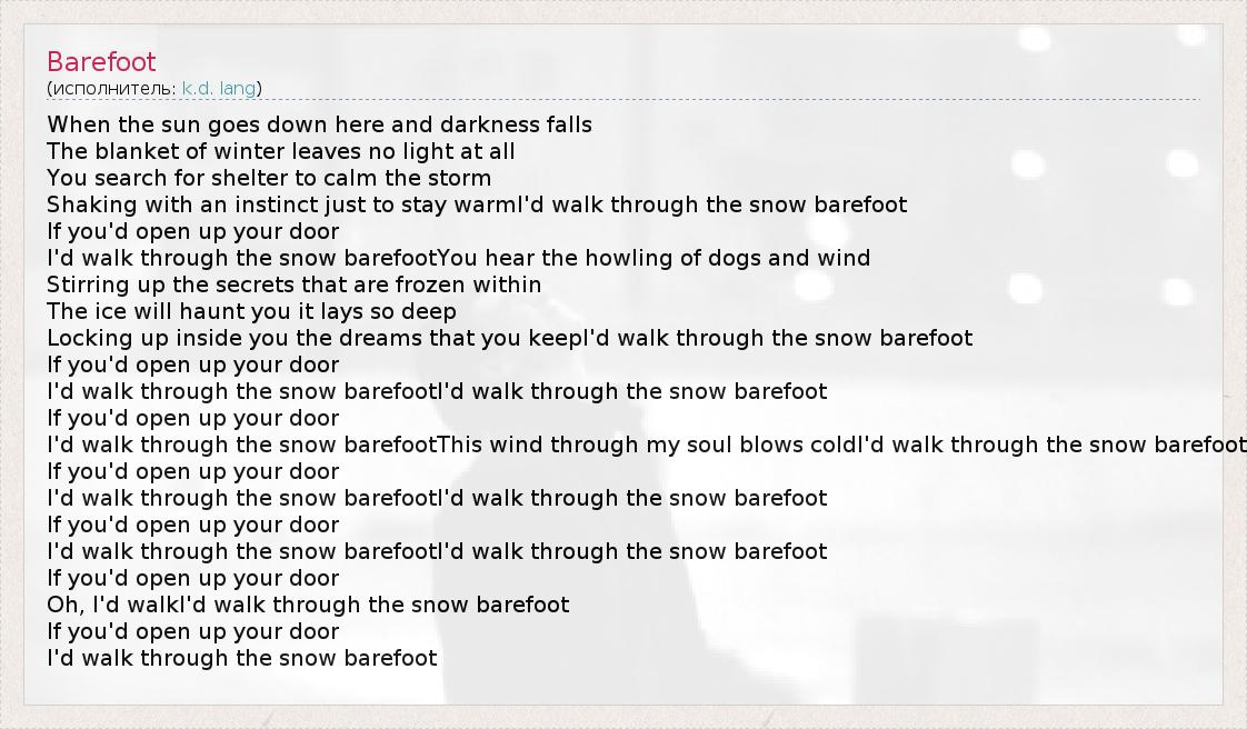 When the sun goes down here and darkness falls The blanket of winter leaves no light at all You search for shelter to calm the storm Shaking with an instinct just to stay warmI'd walk through the snow barefoot If you'd open up your door I'd walk through the snow barefootYou hear the howling of dogs and wind Stirring up the secrets that are frozen within The ice will haunt you it lays so deep Locking up inside you the dreams that you keepI'd walk through the snow barefoot If you'd open up your door I'd walk through the snow barefootI'd walk through the snow barefoot If you'd open up your door I'd walk through the snow barefootThis wind through my soul blows coldI'd walk through the snow barefoot If you'd open up your door I'd walk through the snow barefootI'd walk through the snow barefoot If you'd open up your door I'd walk through the snow barefootI'd walk through the snow barefoot If you'd open up your door Oh, I'd walkI'd walk through the snow barefoot If you'd open up your door I'd walk through the snow barefoot