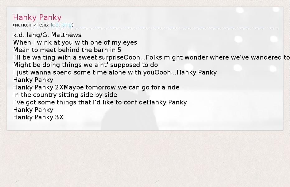 k.d. lang/G. Matthews When I wink at you with one of my eyes Mean to meet behind the barn in 5 I'll be waiting with a sweet surpriseOooh...Folks might wonder where we've wandered to Might be doing things we aint' supposed to do I just wanna spend some time alone with youOooh...Hanky Panky Hanky Panky Hanky Panky 2XMaybe tomorrow we can go for a ride In the country sitting side by side I've got some things that I'd like to confideHanky Panky Hanky Panky Hanky Panky 3X