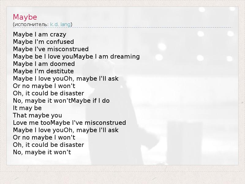 Maybe I am crazy Maybe I'm confused Maybe I've misconstrued Maybe be I love youMaybe I am dreaming Maybe I am doomed Maybe I'm destitute Maybe I love youOh, maybe I'll ask Or no maybe I won't Oh, it could be disaster No, maybe it won'tMaybe if I do It may be That maybe you Love me tooMaybe I've misconstrued Maybe I love youOh, maybe I'll ask Or no maybe I won't Oh, it could be disaster No, maybe it won't