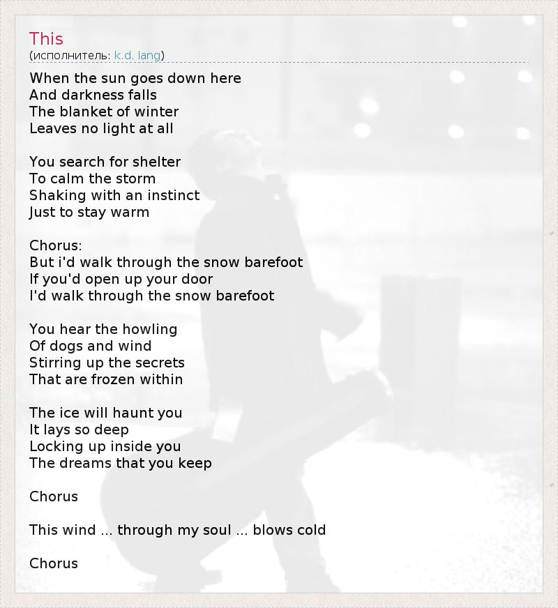 When the sun goes down here And darkness falls The blanket of winter Leaves no light at all You search for shelter To calm the storm Shaking with an instinct Just to stay warm Chorus: But i'd walk through the snow barefoot If you'd open up your door I'd walk through the snow barefoot You hear the howling Of dogs and wind Stirring up the secrets That are frozen within The ice will haunt you It lays so deep Locking up inside you The dreams that you keep Chorus This wind ... through my soul ... blows cold Chorus
