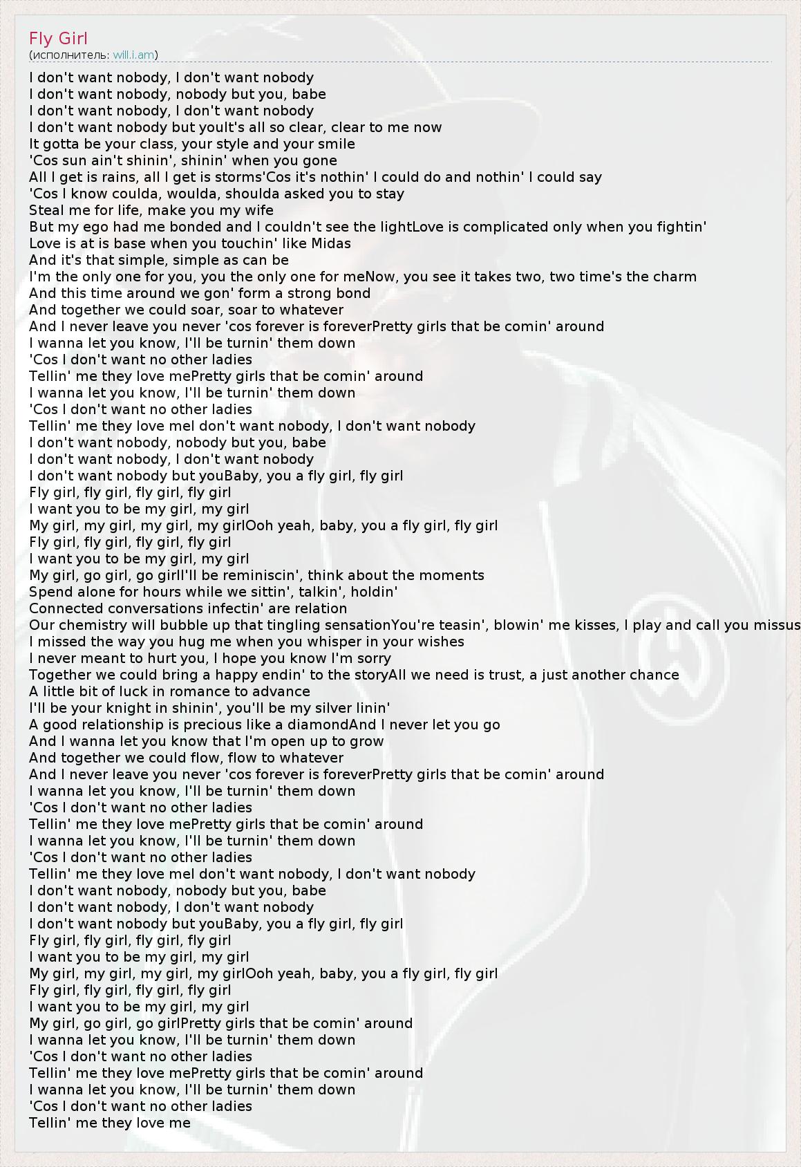 I don't want nobody, I don't want nobody I don't want nobody, nobody but you, babe I don't want nobody, I don't want nobody I don't want nobody but youIt's all so clear, clear to me now It gotta be your class, your style and your smile 'Cos sun ain't shinin', shinin' when you gone All I get is rains, all I get is storms'Cos it's nothin' I could do and nothin' I could say 'Cos I know coulda, woulda, shoulda asked you to stay Steal me for life, make you my wife But my ego had me bonded and I couldn't see the lightLove is complicated only when you fightin' Love is at is base when you touchin' like Midas And it's that simple, simple as can be I'm the only one for you, you the only one for meNow, you see it takes two, two time's the charm And this time around we gon' form a strong bond And together we could soar, soar to whatever And I never leave you never 'cos forever is foreverPretty girls that be comin' around I wanna let you know, I'll be turnin' them down 'Cos I don't want no other ladies Tellin' me they love mePretty girls that be comin' around I wanna let you know, I'll be turnin' them down 'Cos I don't want no other ladies Tellin' me they love meI don't want nobody, I don't want nobody I don't want nobody, nobody but you, babe I don't want nobody, I don't want nobody I don't want nobody but youBaby, you a fly girl, fly girl Fly girl, fly girl, fly girl, fly girl I want you to be my girl, my girl My girl, my girl, my girl, my girlOoh yeah, baby, you a fly girl, fly girl Fly girl, fly girl, fly girl, fly girl I want you to be my girl, my girl My girl, go girl, go girlI'll be reminiscin', think about the moments Spend alone for hours while we sittin', talkin', holdin' Connected conversations infectin' are relation Our chemistry will bubble up that tingling sensationYou're teasin', blowin' me kisses, I play and call you missus I missed the way you hug me when you whisper in your wishes I never meant to hurt you, I hope you know I'm sorry Together we could bring a happy endin' to the storyAll we need is trust, a just another chance A little bit of luck in romance to advance I'll be your knight in shinin', you'll be my silver linin' A good relationship is precious like a diamondAnd I never let you go And I wanna let you know that I'm open up to grow And together we could flow, flow to whatever And I never leave you never 'cos forever is foreverPretty girls that be comin' around I wanna let you know, I'll be turnin' them down 'Cos I don't want no other ladies Tellin' me they love mePretty girls that be comin' around I wanna let you know, I'll be turnin' them down 'Cos I don't want no other ladies Tellin' me they love meI don't want nobody, I don't want nobody I don't want nobody, nobody but you, babe I don't want nobody, I don't want nobody I don't want nobody but youBaby, you a fly girl, fly girl Fly girl, fly girl, fly girl, fly girl I want you to be my girl, my girl My girl, my girl, my girl, my girlOoh yeah, baby, you a fly girl, fly girl Fly girl, fly girl, fly girl, fly girl I want you to be my girl, my girl My girl, go girl, go girlPretty girls that be comin' around I wanna let you know, I'll be turnin' them down 'Cos I don't want no other ladies Tellin' me they love mePretty girls that be comin' around I wanna let you know, I'll be turnin' them down 'Cos I don't want no other ladies Tellin' me they love me