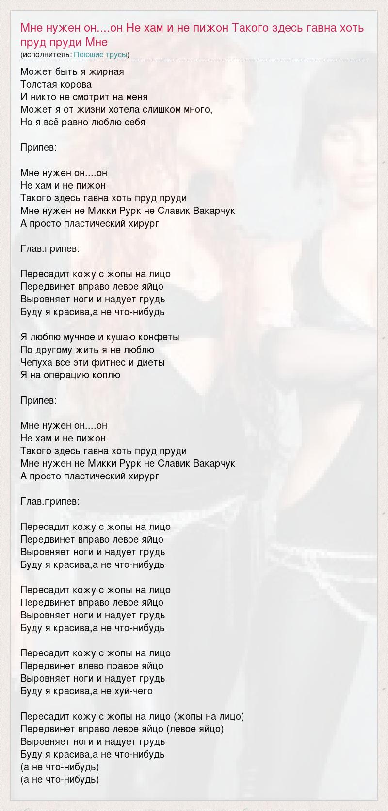 Может быть я жирная Толстая корова И никто не смотрит на меня Может я от жизни хотела слишком много, Но я всё равно люблю себя Припев: Мне нужен он....он Не хам и не пижон Такого здесь гавна хоть пруд пруди Мне нужен не Микки Рурк не Славик Вакарчук А просто пластический хирург Глав.припев: Пересадит кожу с жопы на лицо Передвинет вправо левое яйцо Выровняет ноги и надует грудь Буду я красива,а не что-нибудь Я люблю мучное и кушаю конфеты По другому жить я не люблю Чепуха все эти фитнес и диеты Я на операцию коплю Припев: Мне нужен он....он Не хам и не пижон Такого здесь гавна хоть пруд пруди Мне нужен не Микки Рурк не Славик Вакарчук А просто пластический хирург Глав.припев: Пересадит кожу с жопы на лицо Передвинет вправо левое яйцо Выровняет ноги и надует грудь Буду я красива,а не что-нибудь Пересадит кожу с жопы на лицо Передвинет вправо левое яйцо Выровняет ноги и надует грудь Буду я красива,а не что-нибудь Пересадит кожу с жопы на лицо Передвинет влево правое яйцо Выровняет ноги и надует грудь Буду я красива,а не хуй-чего Пересадит кожу с жопы на лицо (жопы на лицо) Передвинет вправо левое яйцо (левое яйцо) Выровняет ноги и надует грудь Буду я красива,а не что-нибудь (а не что-нибудь) (а не что-нибудь)