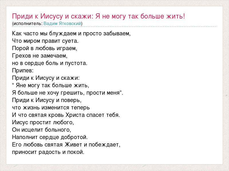Как часто мы блуждаем и просто забываем, Что миром правит суета. Порой в любовь играем, Грехов не замечаем, но в сердце боль и пустота. Припев: Приди к Иисусу и скажи: “ Яне могу так больше жить, Я больше не хочу грешить, прости меня”. Приди к Иисусу и поверь, что жизнь изменится теперь И что святая кровь Христа спасет тебя. Иисус простит любого, Он исцелит больного, Наполнит сердце добротой. Его любовь святая Живет и побеждает, приносит радость и покой.