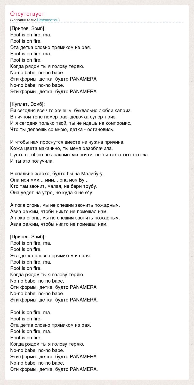 [Припев, Зомб]: Roof is on fire, ma. Roof is on fire. Эта детка словно прямиком из рая. Roof is on fire, ma. Roof is on fire. Когда рядом ты я голову теряю. No-no babe, no-no babe. Эти формы, детка, будто PANAMERA No-no babe, no-no babe. Эти формы, детка, будто PANAMERA [Куплет, Зомб]: Ей сегодня все что хочешь, буквально любой каприз. В личном топе номер раз, девочка супер-приз. И я сегодня только твой, ты не идешь на компромис. Что ты делаешь со мною, детка - остановись. И чтобы нам проснутся вместе не нужна причина. Кожа цвета макачино, ты меня разоблачила. Пусть с тобою не знакомы мы почти, но ты так этого хотела. И ты это получила. В спальне жарко, будто бы на Малибу-у. Она моя ммм... ммм... она моя Бу... Кто там звонит, малая, не бери трубу. Она уедет на утро, но куда я не е*у. А пока огонь, мы не спешим звонить пожарным. Авиа режим, чтобы никто не помешал нам. А пока огонь, мы не спешим звонить пожарным. Авиа режим, чтобы никто не помешал нам. [Припев, Зомб]: Roof is on fire, ma. Roof is on fire. Эта детка словно прямиком из рая. Roof is on fire, ma. Roof is on fire. Когда рядом ты я голову теряю. No-no babe, no-no babe. Эти формы, детка, будто PANAMERA No-no babe, no-no babe. Эти формы, детка, будто PANAMERA. Roof is on fire, ma. Roof is on fire. Эта детка словно прямиком из рая. Roof is on fire, ma. Roof is on fire. Когда рядом ты я голову теряю. No-no babe, no-no babe. Эти формы, детка, будто PANAMERA No-no babe, no-no babe. Эти формы, детка, будто PANAMERA.