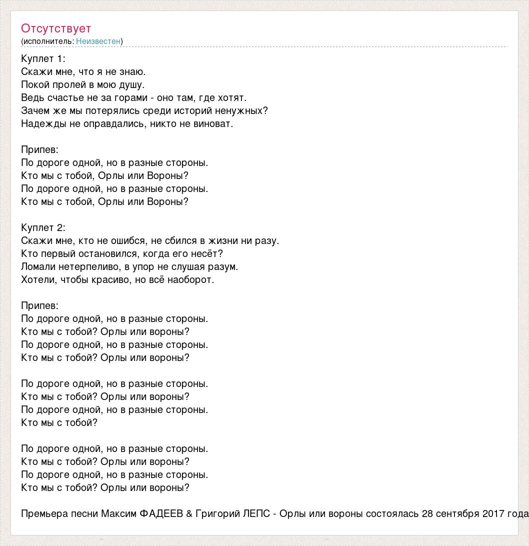 Куплет 1: Скажи мне, что я не знаю. Покой пролей в мою душу. Ведь счастье не за горами - оно там, где хотят. Зачем же мы потерялись среди историй ненужных? Надежды не оправдались, никто не виноват. Припев: По дороге одной, но в разные стороны. Кто мы с тобой, Орлы или Вороны? По дороге одной, но в разные стороны. Кто мы с тобой, Орлы или Вороны? Куплет 2: Скажи мне, кто не ошибся, не сбился в жизни ни разу. Кто первый остановился, когда его несёт? Ломали нетерпеливо, в упор не слушая разум. Хотели, чтобы красиво, но всё наоборот. Припев: По дороге одной, но в разные стороны. Кто мы с тобой? Орлы или вороны? По дороге одной, но в разные стороны. Кто мы с тобой? Орлы или вороны? По дороге одной, но в разные стороны. Кто мы с тобой? Орлы или вороны? По дороге одной, но в разные стороны. Кто мы с тобой? По дороге одной, но в разные стороны. Кто мы с тобой? Орлы или вороны? По дороге одной, но в разные стороны. Кто мы с тобой? Орлы или вороны? Премьера песни Максим ФАДЕЕВ & Григорий ЛЕПС - Орлы или вороны состоялась 28 сентября 2017 года