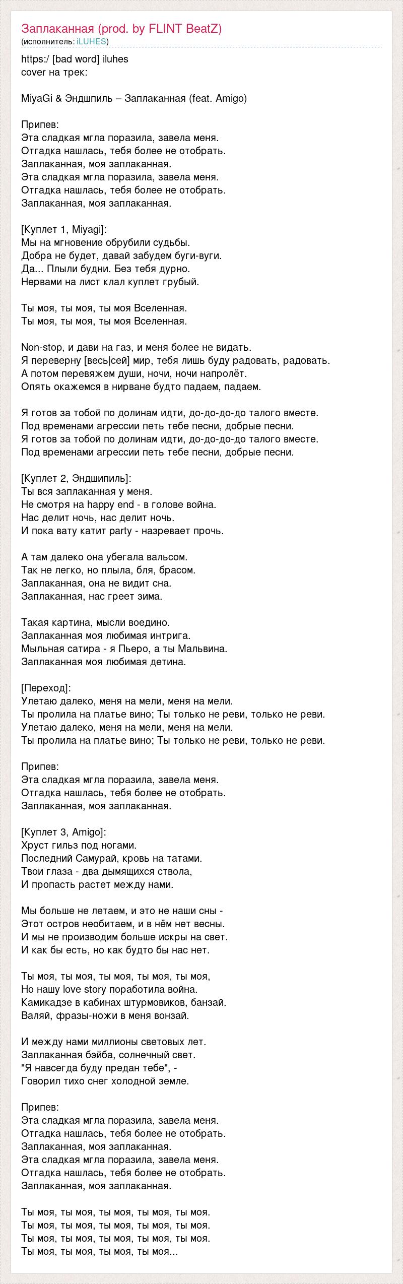 https:/ [bad word] iluhes cover на трек: MiyaGi & Эндшпиль – Заплаканная (feat. Amigo) Припев: Эта сладкая мгла поразила, завела меня. Отгадка нашлась, тебя более не отобрать. Заплаканная, моя заплаканная. Эта сладкая мгла поразила, завела меня. Отгадка нашлась, тебя более не отобрать. Заплаканная, моя заплаканная. [Куплет 1, Miyagi]: Мы на мгновение обрубили судьбы. Добра не будет, давай забудем буги-вуги. Да... Плыли будни. Без тебя дурно. Нервами на лист клал куплет грубый. Ты моя, ты моя, ты моя Вселенная. Ты моя, ты моя, ты моя Вселенная. Non-stop, и дави на газ, и меня более не видать. Я переверну [весь|сей] мир, тебя лишь буду радовать, радовать. А потом перевяжем души, ночи, ночи напролёт. Опять окажемся в нирване будто падаем, падаем. Я готов за тобой по долинам идти, до-до-до-до талого вместе. Под временами агрессии петь тебе песни, добрые песни. Я готов за тобой по долинам идти, до-до-до-до талого вместе. Под временами агрессии петь тебе песни, добрые песни. [Куплет 2, Эндшипиль]: Ты вся заплаканная у меня. Не смотря на happy end - в голове война. Нас делит ночь, нас делит ночь. И пока вату катит party - назревает прочь. А там далеко она убегала вальсом. Так не легко, но плыла, бля, брасом. Заплаканная, она не видит сна. Заплаканная, нас греет зима. Такая картина, мысли воедино. Заплаканная моя любимая интрига. Мыльная сатира - я Пьеро, а ты Мальвина. Заплаканная моя любимая детина. [Переход]: Улетаю далеко, меня на мели, меня на мели. Ты пролила на платье вино; Ты только не реви, только не реви. Улетаю далеко, меня на мели, меня на мели. Ты пролила на платье вино; Ты только не реви, только не реви. Припев: Эта сладкая мгла поразила, завела меня. Отгадка нашлась, тебя более не отобрать. Заплаканная, моя заплаканная. [Куплет 3, Amigo]: Хруст гильз под ногами. Последний Самурай, кровь на татами. Твои глаза - два дымящихся ствола, И пропасть растет между нами. Мы больше не летаем, и это не наши сны - Этот остров необитаем, и в нём нет весны. И мы не производим больше искры на свет. И как бы есть, но как будто бы нас нет. Ты моя, ты моя, ты моя, ты моя, ты моя, Но нашу love story поработила война. Камикадзе в кабинах штурмовиков, банзай. Валяй, фразы-ножи в меня вонзай. И между нами миллионы световых лет. Заплаканная бэйба, солнечный свет. "Я навсегда буду предан тебе", - Говорил тихо снег холодной земле. Припев: Эта сладкая мгла поразила, завела меня. Отгадка нашлась, тебя более не отобрать. Заплаканная, моя заплаканная. Эта сладкая мгла поразила, завела меня. Отгадка нашлась, тебя более не отобрать. Заплаканная, моя заплаканная. Ты моя, ты моя, ты моя, ты моя, ты моя. Ты моя, ты моя, ты моя, ты моя, ты моя. Ты моя, ты моя, ты моя, ты моя, ты моя. Ты моя, ты моя, ты моя, ты моя...