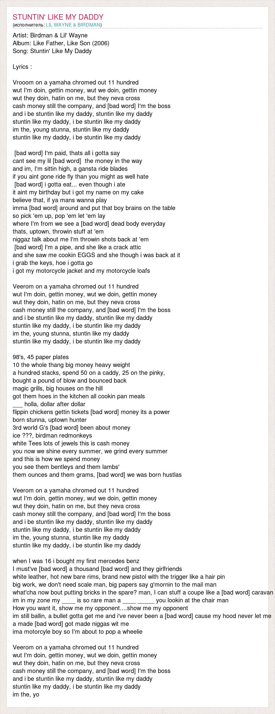 Artist: Birdman & Lil' Wayne Album: Like Father, Like Son (2006) Song: Stuntin' Like My Daddy Lyrics : Vrooom on a yamaha chromed out 11 hundred wut I'm doin, gettin money, wut we doin, gettin money wut they doin, hatin on me, but they neva cross cash money still the company, and [bad word] I'm the boss and i be stuntin like my daddy, stuntin like my daddy stuntin like my daddy, i be stuntin like my daddy im the, young stunna, stuntin like my daddy stuntin like my daddy, i be stuntin like my daddy [bad word] I'm paid, thats all i gotta say cant see my lil [bad word] the money in the way and im, I'm sittin high, a gansta ride blades if you aint gone ride fly than you might as well hate [bad word] i gotta eat... even though i ate it aint my birthday but i got my name on my cake believe that, if ya mans wanna play imma [bad word] around and put that boy brains on the table so pick 'em up, pop 'em let 'em lay where I'm from we see a [bad word] dead body everyday thats, uptown, throwin stuff at 'em niggaz talk about me I'm throwin shots back at 'em [bad word] I'm a pipe, and she like a crack attic and she saw me cookin EGGS and she though i was back at it i grab the keys, hoe i gotta go i got my motorcycle jacket and my motorcycle loafs Veerom on a yamaha chromed out 11 hundred wut I'm doin, gettin money, wut we doin, gettin money wut they doin, hatin on me, but they neva cross cash money still the company, and [bad word] I'm the boss and i be stuntin like my daddy, stuntin like my daddy stuntin like my daddy, i be stuntin like my daddy im the, young stunna, stuntin like my daddy stuntin like my daddy, i be stuntin like my daddy 98's, 45 paper plates 10 the whole thang big money heavy weight a hundred stacks, spend 50 on a caddy, 25 on the pinky, bought a pound of blow and bounced back magic grills, big houses on the hill got them hoes in the kitchen all cookin pan meals ___ holla, dollar after dollar flippin chickens gettin tickets [bad word] money its a power born stunna, uptown hunter 3rd world G's [bad word] been about money ice ???, birdman redmonkeys white Tees lots of jewels this is cash money you now we shine every summer, we grind every summer and this is how we spend money you see them bentleys and them lambs' them ounces and them grams, [bad word] we was born hustlas Veerom on a yamaha chromed out 11 hundred wut I'm doin, gettin money, wut we doin, gettin money wut they doin, hatin on me, but they neva cross cash money still the company, and [bad word] I'm the boss and i be stuntin like my daddy, stuntin like my daddy stuntin like my daddy, i be stuntin like my daddy im the, young stunna, stuntin like my daddy stuntin like my daddy, i be stuntin like my daddy when I was 16 i bought my first mercedes benz I must've [bad word] a thousand [bad word] and they girlfriends white leather, hot new bare rims, brand new pistol with the trigger like a hair pin big work, we don't need scale man, big papers say g'mornin to the mail man what'cha now bout putting bricks in the spare? man, I can stuff a coupe like a [bad word] caravan im in my zone my ____ is so rare man a ____ _____ you lookin at the chair man How you want it, show me my opponent....show me my opponent im still ballin, a bullet gotta get me and i've never been a [bad word] cause my hood never let me a made [bad word] got made niggas wit me ima motorcyle boy so I'm about to pop a wheelie Veerom on a yamaha chromed out 11 hundred wut I'm doin, gettin money, wut we doin, gettin money wut they doin, hatin on me, but they neva cross cash money still the company, and [bad word] I'm the boss and i be stuntin like my daddy, stuntin like my daddy stuntin like my daddy, i be stuntin like my daddy im the, yo
