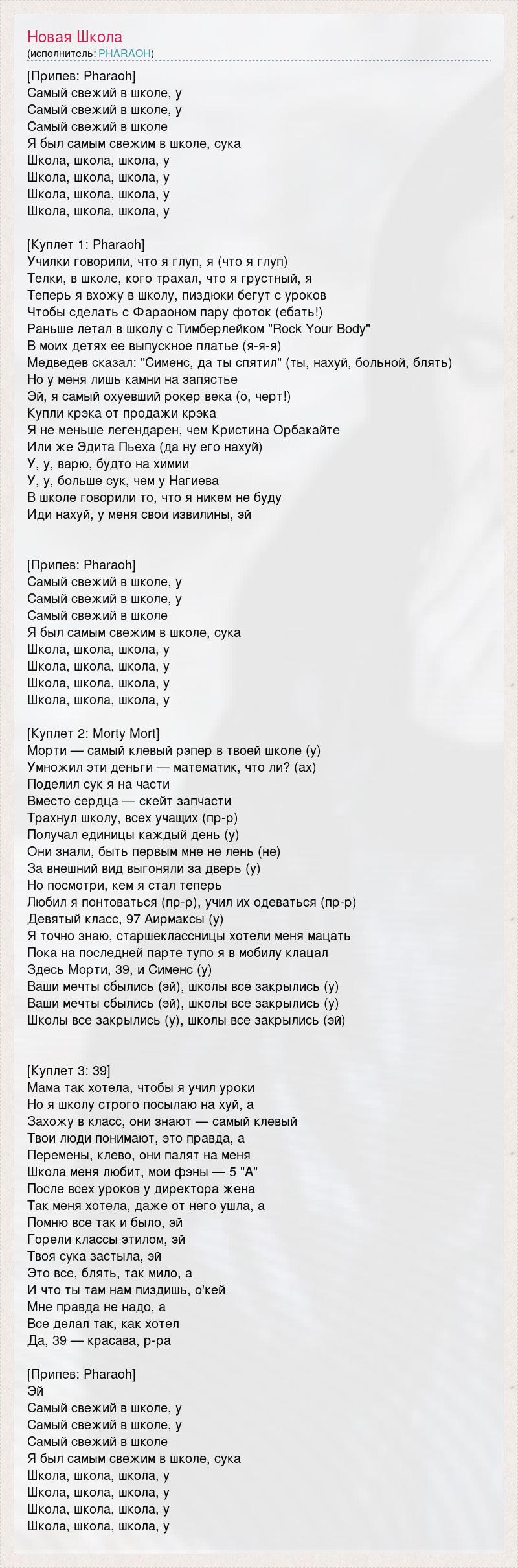 [Припев: Pharaoh] Самый свежий в школе, у Самый свежий в школе, у Самый свежий в школе Я был самым свежим в школе, сука Школа, школа, школа, у Школа, школа, школа, у Школа, школа, школа, у Школа, школа, школа, у [Куплет 1: Pharaoh] Училки говорили, что я глуп, я (что я глуп) Телки, в школе, кого трахал, что я грустный, я Теперь я вхожу в школу, пиздюки бегут с уроков Чтобы сделать с Фараоном пару фоток (ебать!) Раньше летал в школу с Тимберлейком "Rock Your Body" В моих детях ее выпускное платье (я-я-я) Медведев сказал: "Сименс, да ты спятил" (ты, нахуй, больной, блять) Но у меня лишь камни на запястье Эй, я самый охуевший рокер века (о, черт!) Купли крэка от продажи крэка Я не меньше легендарен, чем Кристина Орбакайте Или же Эдита Пьеха (да ну его нахуй) У, у, варю, будто на химии У, у, больше сук, чем у Нагиева В школе говорили то, что я никем не буду Иди нахуй, у меня свои извилины, эй [Припев: Pharaoh] Самый свежий в школе, у Самый свежий в школе, у Самый свежий в школе Я был самым свежим в школе, сука Школа, школа, школа, у Школа, школа, школа, у Школа, школа, школа, у Школа, школа, школа, у [Куплет 2: Morty Mort] Морти — самый клевый рэпер в твоей школе (у) Умножил эти деньги — математик, что ли? (ах) Поделил сук я на части Вместо сердца — скейт запчасти Трахнул школу, всех учащих (пр-р) Получал единицы каждый день (у) Они знали, быть первым мне не лень (не) За внешний вид выгоняли за дверь (у) Но посмотри, кем я стал теперь Любил я понтоваться (пр-р), учил их одеваться (пр-р) Девятый класс, 97 Аирмаксы (у) Я точно знаю, старшеклассницы хотели меня мацать Пока на последней парте тупо я в мобилу клацал Здесь Морти, 39, и Сименс (у) Ваши мечты сбылись (эй), школы все закрылись (у) Ваши мечты сбылись (эй), школы все закрылись (у) Школы все закрылись (у), школы все закрылись (эй) [Куплет 3: 39] Мама так хотела, чтобы я учил уроки Но я школу строго посылаю на хуй, а Захожу в класс, они знают — самый клевый Твои люди понимают, это правда, а Перемены, клево, они палят на меня Школа меня любит, мои фэны — 5 "А" После всех уроков у директора жена Так меня хотела, даже от него ушла, а Помню все так и было, эй Горели классы этилом, эй Твоя сука застыла, эй Это все, блять, так мило, а И что ты там нам пиздишь, о'кей Мне правда не надо, а Все делал так, как хотел Да, 39 — красава, р-ра [Припев: Pharaoh] Эй Самый свежий в школе, у Самый свежий в школе, у Самый свежий в школе Я был самым свежим в школе, сука Школа, школа, школа, у Школа, школа, школа, у Школа, школа, школа, у Школа, школа, школа, у