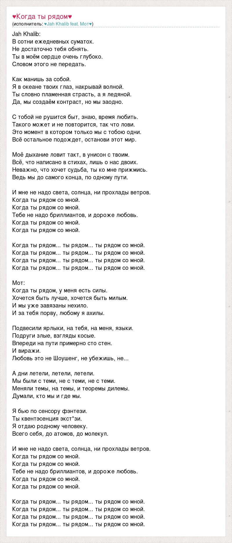 Jah Khalib: В сотни ежедневных суматох. Не достаточно тебя обнять. Ты в моём сердце очень глубоко. Словом этого не передать. Как манишь за собой. Я в океане твоих глаз, накрывай волной. Ты словно пламенная страсть, а я ледяной. Да, мы создаём контраст, но мы заодно. С тобой не рушится быт, знаю, время любить. Такого может и не повторится, так что лови. Это момент в котором только мы с тобою одни. Всё остальное подождет, останови этот мир. Моё дыхание ловит такт, в унисон с твоим. Всё, что написано в стихах, лишь о нас двоих. Неважно, что хочет судьба, ты ко мне прижмись. Ведь мы до самого конца, по одному пути. И мне не надо света, солнца, ни прохлады ветров. Когда ты рядом со мной. Когда ты рядом со мной. Тебе не надо бриллиантов, и дороже любовь. Когда ты рядом со мной. Когда ты рядом со мной. Когда ты рядом... ты рядом... ты рядом со мной. Когда ты рядом... ты рядом... ты рядом со мной. Когда ты рядом... ты рядом... ты рядом со мной. Когда ты рядом... ты рядом... ты рядом со мной. Мот: Когда ты рядом, у меня есть силы. Хочется быть лучше, хочется быть милым. И мы уже завязаны нехило. И за тебя порву, любому я ахилы. Подвесили ярлыки, на тебя, на меня, языки. Подруги злые, взгляды косые. Впереди на пути примерно сто стен. И виражи. Любовь это не Шоушенг, не убежишь, не... А дни летели, летели, летели. Мы были с теми, не с теми, не с теми. Меняли темы, на темы, и теоремы дилемы. Думали, кто мы и где мы. Я бью по сенсору фэнтези. Ты квентэсенция экст*зи. Я отдаю родному человеку. Всего себя, до атомов, до молекул. И мне не надо света, солнца, ни прохлады ветров. Когда ты рядом со мной. Когда ты рядом со мной. Тебе не надо бриллиантов, и дороже любовь. Когда ты рядом со мной. Когда ты рядом со мной. Когда ты рядом... ты рядом... ты рядом со мной. Когда ты рядом... ты рядом... ты рядом со мной. Когда ты рядом... ты рядом... ты рядом со мной. Когда ты рядом... ты рядом... ты рядом со мной.