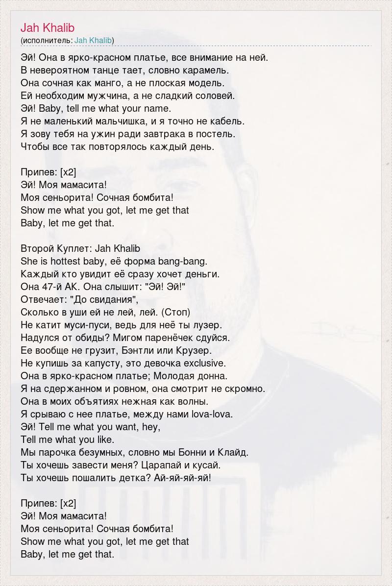 Эй! Она в ярко-красном платье, все внимание на ней. В невероятном танце тает, словно карамель. Она сочная как манго, а не плоская модель. Ей необходим мужчина, а не сладкий соловей. Эй! Baby, tell me what your name. Я не маленький мальчишка, и я точно не кабель. Я зову тебя на ужин ради завтрака в постель. Чтобы все так повторялось каждый день. Припев: [x2] Эй! Моя мамасита! Моя сеньорита! Сочная бомбита! Show me what you got, let me get that Baby, let me get that. Второй Куплет: Jah Khalib She is hottest baby, её форма bang-bang. Каждый кто увидит её сразу хочет деньги. Она 47-й АК. Она слышит: "Эй! Эй!" Отвечает: "До свидания", Сколько в уши ей не лей, лей. (Стоп) Не катит муси-пуси, ведь для неё ты лузер. Надулся от обиды? Мигом паренёчек сдуйся. Ее вообще не грузит, Бэнтли или Крузер. Не купишь за капусту, это девочка exclusive. Она в ярко-красном платье; Молодая донна. Я на сдержанном и ровном, она смотрит не скромно. Она в моих объятиях нежная как волны. Я срываю с нее платье, между нами lova-lova. Эй! Tell me what you want, hey, Tell me what you like. Мы парочка безумных, словно мы Бонни и Клайд. Ты хочешь завести меня? Царапай и кусай. Ты хочешь пошалить детка? Ай-яй-яй-яй! Припев: [x2] Эй! Моя мамасита! Моя сеньорита! Сочная бомбита! Show me what you got, let me get that Baby, let me get that.