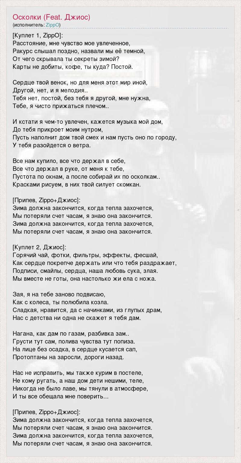 [Куплет 1, ZippO]: Расстояние, мне чувство мое увлеченное, Ракурс слышал поздно, назвали мы её темной, От чего скрывала ты секреты зимой? Карты не добиты, кофе, ты куда? Постой. Сердце твой венок, но для меня этот мир иной, Другой, нет, и я мелодия.. Тебя нет, постой, без тебя я другой, мне нужна, Тебе, я чисто прижаться плечом.. И кстати я чем-то увлечен, кажется музыка мой дом, До тебя прикроет моим нутром, Пусть наполнит дом твой смех и нам пусть оно по городу, У тебя разойдется о ветра. Все нам купило, все что держал в себе, Все что держал в руке, от меня к тебе, Пустота по окнам, а после собирай их по осколкам.. Красками рисуем, в них твой силует скомкан. [Припев, Zippo+Джиос]: Зима должна закончится, когда тепла захочется, Мы потеряли счет часам, я знаю она закончится. Зима должна закончится, когда тепла захочется, Мы потеряли счет часам, я знаю она закончится. [Куплет 2, Джиос]: Горячий чай, фотки, фильтры, эффекты, фесшай, Как сердце покрепче держать или что тебя раздражает, Подписи, смайлы, сердца, наша любовь сука, злая. Мы вместе не готы, она настолько жи ела с ножа. Зая, я на тебе заново подвисаю, Как с колеса, ты полюбила козла. Сладкая, нравится, да с начинками, из глупых драм, Нас с детства ни одна не скажет я тебя дам. Нагана, как дам по газам, разбивка зам.. Грусти тут сам, полива чувства тут попиза. На лице без осадка, в сердце кусается сап, Протоптаны на заросли, дороги назад. Нас не исправить, мы также курим в постеле, Не кому ругать, а наш дом дети нешими, теле, Никогда не было лаве, мы тянули в атмосфере, И ты все обещала мне поверить... [Припев, Zippo+Джиос]: Зима должна закончится, когда тепла захочется, Мы потеряли счет часам, я знаю она закончится. Зима должна закончится, когда тепла захочется, Мы потеряли счет часам, я знаю она закончится.