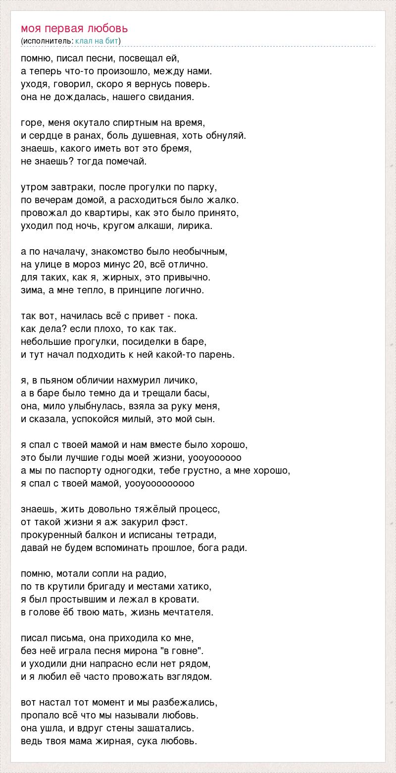 помню, писал песни, посвещал ей, а теперь что-то произошло, между нами. уходя, говорил, скоро я вернусь поверь. она не дождалась, нашего свидания. горе, меня окутало спиртным на время, и сердце в ранах, боль душевная, хоть обнуляй. знаешь, какого иметь вот это бремя, не знаешь? тогда помечай. утром завтраки, после прогулки по парку, по вечерам домой, а расходиться было жалко. провожал до квартиры, как это было принято, уходил под ночь, кругом алкаши, лирика. а по началачу, знакомство было необычным, на улице в мороз минус 20, всё отлично. для таких, как я, жирных, это привычно. зима, а мне тепло, в принципе логично. так вот, начилась всё с привет - пока. как дела? если плохо, то как так. небольшие прогулки, посиделки в баре, и тут начал подходить к ней какой-то парень. я, в пьяном обличии нахмурил личико, а в баре было темно да и трещали басы, она, мило улыбнулась, взяла за руку меня, и сказала, успокойся милый, это мой сын. я спал с твоей мамой и нам вместе было хорошо, это были лучшие годы моей жизни, уооуоооооо а мы по паспорту одногодки, тебе грустно, а мне хорошо, я спал с твоей мамой, уооуооооооооо знаешь, жить довольно тяжёлый процесс, от такой жизни я аж закурил фэст. прокуренный балкон и исписаны тетради, давай не будем вспоминать прошлое, бога ради. помню, мотали сопли на радио, по тв крутили бригаду и местами хатико, я был простывшим и лежал в кровати. в голове ёб твою мать, жизнь мечтателя. писал письма, она приходила ко мне, без неё играла песня мирона "в говне". и уходили дни напрасно если нет рядом, и я любил её часто провожать взглядом. вот настал тот момент и мы разбежались, пропало всё что мы называли любовь. она ушла, и вдруг стены зашатались. ведь твоя мама жирная, сука любовь.