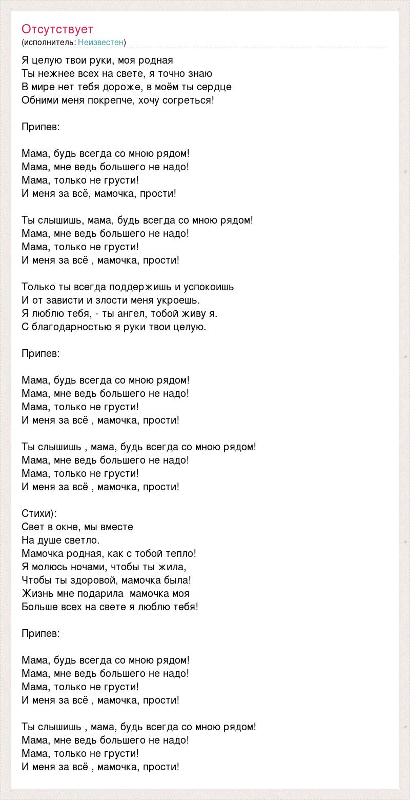 Я целую твои руки, моя родная Ты нежнее всех на свете, я точно знаю В мире нет тебя дороже, в моём ты сердце Обними меня покрепче, хочу согреться! Припев: Мама, будь всегда со мною рядом! Мама, мне ведь большего не надо! Мама, только не грусти! И меня за всё, мамочка, прости! Ты слышишь, мама, будь всегда со мною рядом! Мама, мне ведь большего не надо! Мама, только не грусти! И меня за всё , мамочка, прости! Только ты всегда поддержишь и успокоишь И от зависти и злости меня укроешь. Я люблю тебя, - ты ангел, тобой живу я. С благодарностью я руки твои целую. Припев: Мама, будь всегда со мною рядом! Мама, мне ведь большего не надо! Мама, только не грусти! И меня за всё , мамочка, прости! Ты слышишь , мама, будь всегда со мною рядом! Мама, мне ведь большего не надо! Мама, только не грусти! И меня за всё , мамочка, прости! Стихи): Свет в окне, мы вместе На душе светло. Мамочка родная, как с тобой тепло! Я молюсь ночами, чтобы ты жила, Чтобы ты здоровой, мамочка была! Жизнь мне подарила мамочка моя Больше всех на свете я люблю тебя! Припев: Мама, будь всегда со мною рядом! Мама, мне ведь большего не надо! Мама, только не грусти! И меня за всё , мамочка, прости! Ты слышишь , мама, будь всегда со мною рядом! Мама, мне ведь большего не надо! Мама, только не грусти! И меня за всё , мамочка, прости!