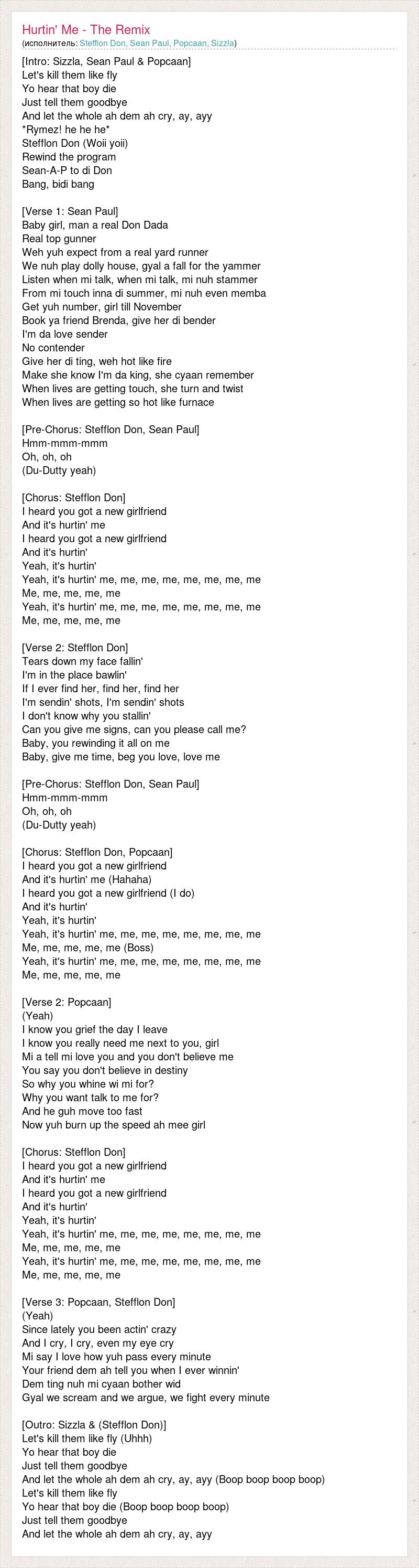 [Intro: Sizzla, Sean Paul & Popcaan] Let's kill them like fly Yo hear that boy die Just tell them goodbye And let the whole ah dem ah cry, ay, ayy *Rymez! he he he* Stefflon Don (Woii yoii) Rewind the program Sean-A-P to di Don Bang, bidi bang [Verse 1: Sean Paul] Baby girl, man a real Don Dada Real top gunner Weh yuh expect from a real yard runner We nuh play dolly house, gyal a fall for the yammer Listen when mi talk, when mi talk, mi nuh stammer From mi touch inna di summer, mi nuh even memba Get yuh number, girl till November Book ya friend Brenda, give her di bender I'm da love sender No contender Give her di ting, weh hot like fire Make she know I'm da king, she cyaan remember When lives are getting touch, she turn and twist When lives are getting so hot like furnace [Pre-Chorus: Stefflon Don, Sean Paul] Hmm-mmm-mmm Oh, oh, oh (Du-Dutty yeah) [Chorus: Stefflon Don] I heard you got a new girlfriend And it's hurtin' me I heard you got a new girlfriend And it's hurtin' Yeah, it's hurtin' Yeah, it's hurtin' me, me, me, me, me, me, me, me Me, me, me, me, me Yeah, it's hurtin' me, me, me, me, me, me, me, me Me, me, me, me, me [Verse 2: Stefflon Don] Tears down my face fallin' I'm in the place bawlin' If I ever find her, find her, find her I'm sendin' shots, I'm sendin' shots I don't know why you stallin' Can you give me signs, can you please call me? Baby, you rewinding it all on me Baby, give me time, beg you love, love me [Pre-Chorus: Stefflon Don, Sean Paul] Hmm-mmm-mmm Oh, oh, oh (Du-Dutty yeah) [Chorus: Stefflon Don, Popcaan] I heard you got a new girlfriend And it's hurtin' me (Hahaha) I heard you got a new girlfriend (I do) And it's hurtin' Yeah, it's hurtin' Yeah, it's hurtin' me, me, me, me, me, me, me, me Me, me, me, me, me (Boss) Yeah, it's hurtin' me, me, me, me, me, me, me, me Me, me, me, me, me [Verse 2: Popcaan] (Yeah) I know you grief the day I leave I know you really need me next to you, girl Mi a tell mi love you and you don't believe me You say you don't believe in destiny So why you whine wi mi for? Why you want talk to me for? And he guh move too fast Now yuh burn up the speed ah mee girl [Chorus: Stefflon Don] I heard you got a new girlfriend And it's hurtin' me I heard you got a new girlfriend And it's hurtin' Yeah, it's hurtin' Yeah, it's hurtin' me, me, me, me, me, me, me, me Me, me, me, me, me Yeah, it's hurtin' me, me, me, me, me, me, me, me Me, me, me, me, me [Verse 3: Popcaan, Stefflon Don] (Yeah) Since lately you been actin' crazy And I cry, I cry, even my eye cry Mi say I love how yuh pass every minute Your friend dem ah tell you when I ever winnin' Dem ting nuh mi cyaan bother wid Gyal we scream and we argue, we fight every minute [Outro: Sizzla & (Stefflon Don)] Let's kill them like fly (Uhhh) Yo hear that boy die Just tell them goodbye And let the whole ah dem ah cry, ay, ayy (Boop boop boop boop) Let's kill them like fly Yo hear that boy die (Boop boop boop boop) Just tell them goodbye And let the whole ah dem ah cry, ay, ayy