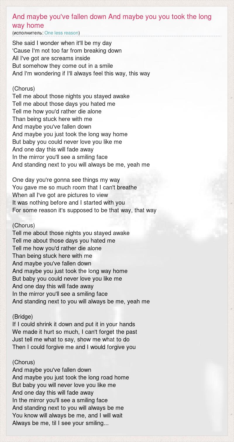 She said I wonder when it'll be my day 'Cause I'm not too far from breaking down All I've got are screams inside But somehow they come out in a smile And I'm wondering if I'll always feel this way, this way (Chorus) Tell me about those nights you stayed awake Tell me about those days you hated me Tell me how you'd rather die alone Than being stuck here with me And maybe you've fallen down And maybe you just took the long way home But baby you could never love you like me And one day this will fade away In the mirror you'll see a smiling face And standing next to you will always be me, yeah me One day you're gonna see things my way You gave me so much room that I can't breathe When all I've got are pictures to view It was nothing before and I started with you For some reason it's supposed to be that way, that way (Chorus) Tell me about those nights you stayed awake Tell me about those days you hated me Tell me how you'd rather die alone Than being stuck here with me And maybe you've fallen down And maybe you just took the long way home But baby you could never love you like me And one day this will fade away In the mirror you'll see a smiling face And standing next to you will always be me, yeah me (Bridge) If I could shrink it down and put it in your hands We made it hurt so much, I can't forget the past Just tell me what to say, show me what to do Then I could forgive me and I would forgive you (Chorus) And maybe you've fallen down And maybe you just took the long road home But baby you will never love you like me And one day this will fade away In the mirror you'll see a smiling face And standing next to you will always be me You know will always be me, and I will wait Always be me, til I see your smiling...