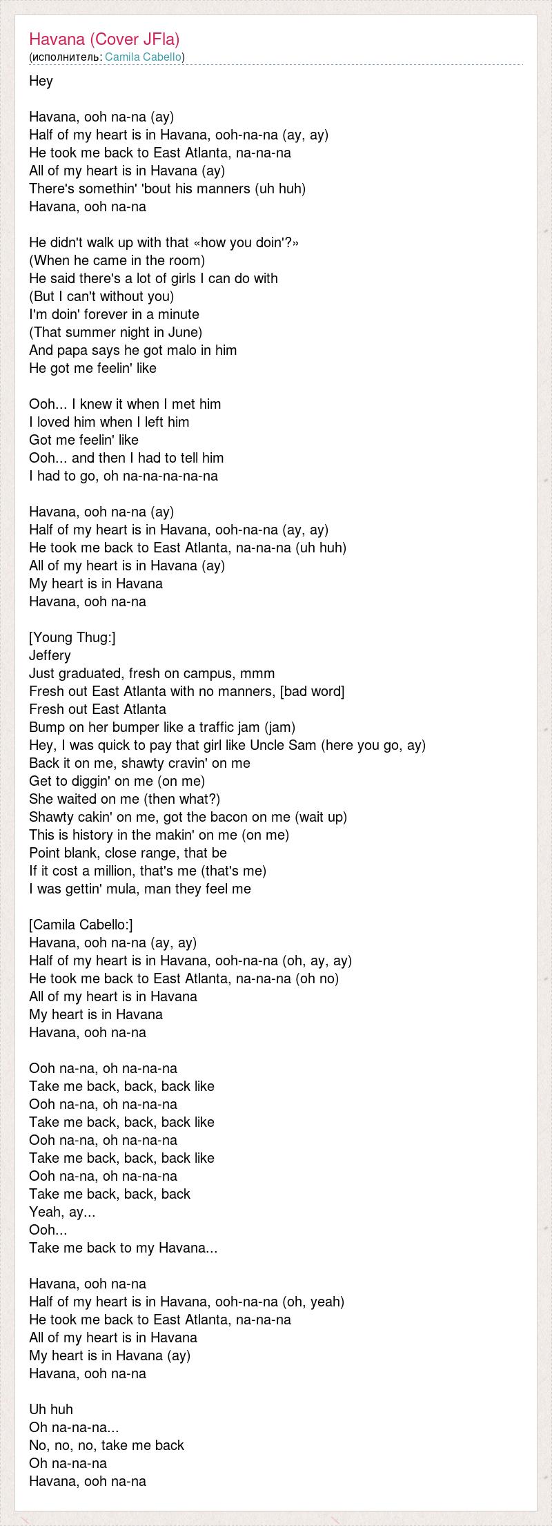 Hey Havana, ooh na-na (ay) Half of my heart is in Havana, ooh-na-na (ay, ay) He took me back to East Atlanta, na-na-na All of my heart is in Havana (ay) There's somethin' 'bout his manners (uh huh) Havana, ooh na-na He didn't walk up with that «how you doin'?» (When he came in the room) He said there's a lot of girls I can do with (But I can't without you) I'm doin' forever in a minute (That summer night in June) And papa says he got malo in him He got me feelin' like Ooh... I knew it when I met him I loved him when I left him Got me feelin' like Ooh... and then I had to tell him I had to go, oh na-na-na-na-na Havana, ooh na-na (ay) Half of my heart is in Havana, ooh-na-na (ay, ay) He took me back to East Atlanta, na-na-na (uh huh) All of my heart is in Havana (ay) My heart is in Havana Havana, ooh na-na [Young Thug:] Jeffery Just graduated, fresh on campus, mmm Fresh out East Atlanta with no manners, [bad word] Fresh out East Atlanta Bump on her bumper like a traffic jam (jam) Hey, I was quick to pay that girl like Uncle Sam (here you go, ay) Back it on me, shawty cravin' on me Get to diggin' on me (on me) She waited on me (then what?) Shawty cakin' on me, got the bacon on me (wait up) This is history in the makin' on me (on me) Point blank, close range, that be If it cost a million, that's me (that's me) I was gettin' mula, man they feel me [Camila Cabello:] Havana, ooh na-na (ay, ay) Half of my heart is in Havana, ooh-na-na (oh, ay, ay) He took me back to East Atlanta, na-na-na (oh no) All of my heart is in Havana My heart is in Havana Havana, ooh na-na Ooh na-na, oh na-na-na Take me back, back, back like Ooh na-na, oh na-na-na Take me back, back, back like Ooh na-na, oh na-na-na Take me back, back, back like Ooh na-na, oh na-na-na Take me back, back, back Yeah, ay... Ooh... Take me back to my Havana... Havana, ooh na-na Half of my heart is in Havana, ooh-na-na (oh, yeah) He took me back to East Atlanta, na-na-na All of my heart is in Havana My heart is in Havana (ay) Havana, ooh na-na Uh huh Oh na-na-na... No, no, no, take me back Oh na-na-na Havana, ooh na-na