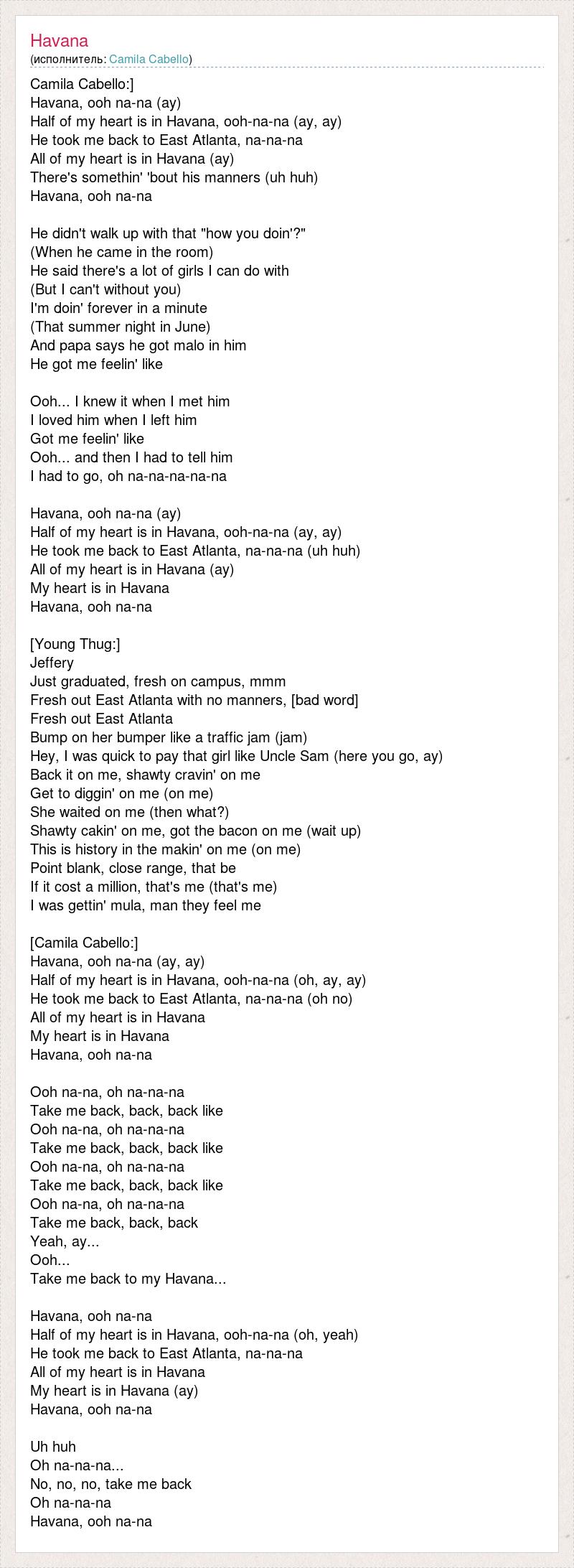 Camila Cabello:] Havana, ooh na-na (ay) Half of my heart is in Havana, ooh-na-na (ay, ay) He took me back to East Atlanta, na-na-na All of my heart is in Havana (ay) There's somethin' 'bout his manners (uh huh) Havana, ooh na-na He didn't walk up with that "how you doin'?" (When he came in the room) He said there's a lot of girls I can do with (But I can't without you) I'm doin' forever in a minute (That summer night in June) And papa says he got malo in him He got me feelin' like Ooh... I knew it when I met him I loved him when I left him Got me feelin' like Ooh... and then I had to tell him I had to go, oh na-na-na-na-na Havana, ooh na-na (ay) Half of my heart is in Havana, ooh-na-na (ay, ay) He took me back to East Atlanta, na-na-na (uh huh) All of my heart is in Havana (ay) My heart is in Havana Havana, ooh na-na [Young Thug:] Jeffery Just graduated, fresh on campus, mmm Fresh out East Atlanta with no manners, [bad word] Fresh out East Atlanta Bump on her bumper like a traffic jam (jam) Hey, I was quick to pay that girl like Uncle Sam (here you go, ay) Back it on me, shawty cravin' on me Get to diggin' on me (on me) She waited on me (then what?) Shawty cakin' on me, got the bacon on me (wait up) This is history in the makin' on me (on me) Point blank, close range, that be If it cost a million, that's me (that's me) I was gettin' mula, man they feel me [Camila Cabello:] Havana, ooh na-na (ay, ay) Half of my heart is in Havana, ooh-na-na (oh, ay, ay) He took me back to East Atlanta, na-na-na (oh no) All of my heart is in Havana My heart is in Havana Havana, ooh na-na Ooh na-na, oh na-na-na Take me back, back, back like Ooh na-na, oh na-na-na Take me back, back, back like Ooh na-na, oh na-na-na Take me back, back, back like Ooh na-na, oh na-na-na Take me back, back, back Yeah, ay... Ooh... Take me back to my Havana... Havana, ooh na-na Half of my heart is in Havana, ooh-na-na (oh, yeah) He took me back to East Atlanta, na-na-na All of my heart is in Havana My heart is in Havana (ay) Havana, ooh na-na Uh huh Oh na-na-na... No, no, no, take me back Oh na-na-na Havana, ooh na-na