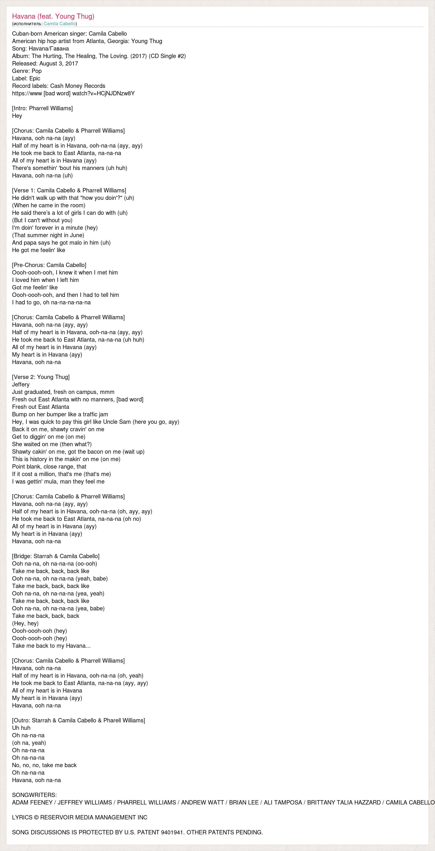 Cuban-born American singer: Camila Cabello American hip hop artist from Atlanta, Georgia: Young Thug Song: Havana/Гавана Album: The Hurting, The Healing, The Loving. (2017) (CD Single #2) Released: August 3, 2017 Genre: Pop Label: Epic Record labels: Cash Money Records https://www [bad word] watch?v=HCjNJDNzw8Y [Intro: Pharrell Williams] Hey [Chorus: Camila Cabello & Pharrell Williams] Havana, ooh na-na (ayy) Half of my heart is in Havana, ooh-na-na (ayy, ayy) He took me back to East Atlanta, na-na-na All of my heart is in Havana (ayy) There's somethin' 'bout his manners (uh huh) Havana, ooh na-na (uh) [Verse 1: Camila Cabello & Pharrell Williams] He didn't walk up with that "how you doin'?" (uh) (When he came in the room) He said there’s a lot of girls I can do with (uh) (But I can't without you) I'm doin' forever in a minute (hey) (That summer night in June) And papa says he got malo in him (uh) He got me feelin' like [Pre-Chorus: Camila Cabello] Oooh-oooh-ooh, I knew it when I met him I loved him when I left him Got me feelin' like Oooh-oooh-ooh, and then I had to tell him I had to go, oh na-na-na-na-na [Chorus: Camila Cabello & Pharrell Williams] Havana, ooh na-na (ayy, ayy) Half of my heart is in Havana, ooh-na-na (ayy, ayy) He took me back to East Atlanta, na-na-na (uh huh) All of my heart is in Havana (ayy) My heart is in Havana (ayy) Havana, ooh na-na [Verse 2: Young Thug] Jeffery Just graduated, fresh on campus, mmm Fresh out East Atlanta with no manners, [bad word] Fresh out East Atlanta Bump on her bumper like a traffic jam Hey, I was quick to pay this girl like Uncle Sam (here you go, ayy) Back it on me, shawty cravin' on me Get to diggin' on me (on me) She waited on me (then what?) Shawty cakin' on me, got the bacon on me (wait up) This is history in the makin' on me (on me) Point blank, close range, that If it cost a million, that's me (that's me) I was gettin' mula, man they feel me [Chorus: Camila Cabello & Pharrell Williams] Havana, ooh na-na (ayy, ayy) Half of my heart is in Havana, ooh-na-na (oh, ayy, ayy) He took me back to East Atlanta, na-na-na (oh no) All of my heart is in Havana (ayy) My heart is in Havana (ayy) Havana, ooh na-na [Bridge: Starrah & Camila Cabello] Ooh na-na, oh na-na-na (oo-ooh) Take me back, back, back like Ooh na-na, oh na-na-na (yeah, babe) Take me back, back, back like Ooh na-na, oh na-na-na (yea, yeah) Take me back, back, back like Ooh na-na, oh na-na-na (yea, babe) Take me back, back, back (Hey, hey) Oooh-oooh-ooh (hey) Oooh-oooh-ooh (hey) Take me back to my Havana... [Chorus: Camila Cabello & Pharrell Williams] Havana, ooh na-na Half of my heart is in Havana, ooh-na-na (oh, yeah) He took me back to East Atlanta, na-na-na (ayy, ayy) All of my heart is in Havana My heart is in Havana (ayy) Havana, ooh na-na [Outro: Starrah & Camila Cabello & Pharell Williams] Uh huh Oh na-na-na (oh na, yeah) Oh na-na-na Oh na-na-na No, no, no, take me back Oh na-na-na Havana, ooh na-na SONGWRITERS: ADAM FEENEY / JEFFREY WILLIAMS / PHARRELL WILLIAMS / ANDREW WATT / BRIAN LEE / ALI TAMPOSA / BRITTANY TALIA HAZZARD / CAMILA CABELLO LYRICS © RESERVOIR MEDIA MANAGEMENT INC SONG DISCUSSIONS IS PROTECTED BY U.S. PATENT 9401941. OTHER PATENTS PENDING.