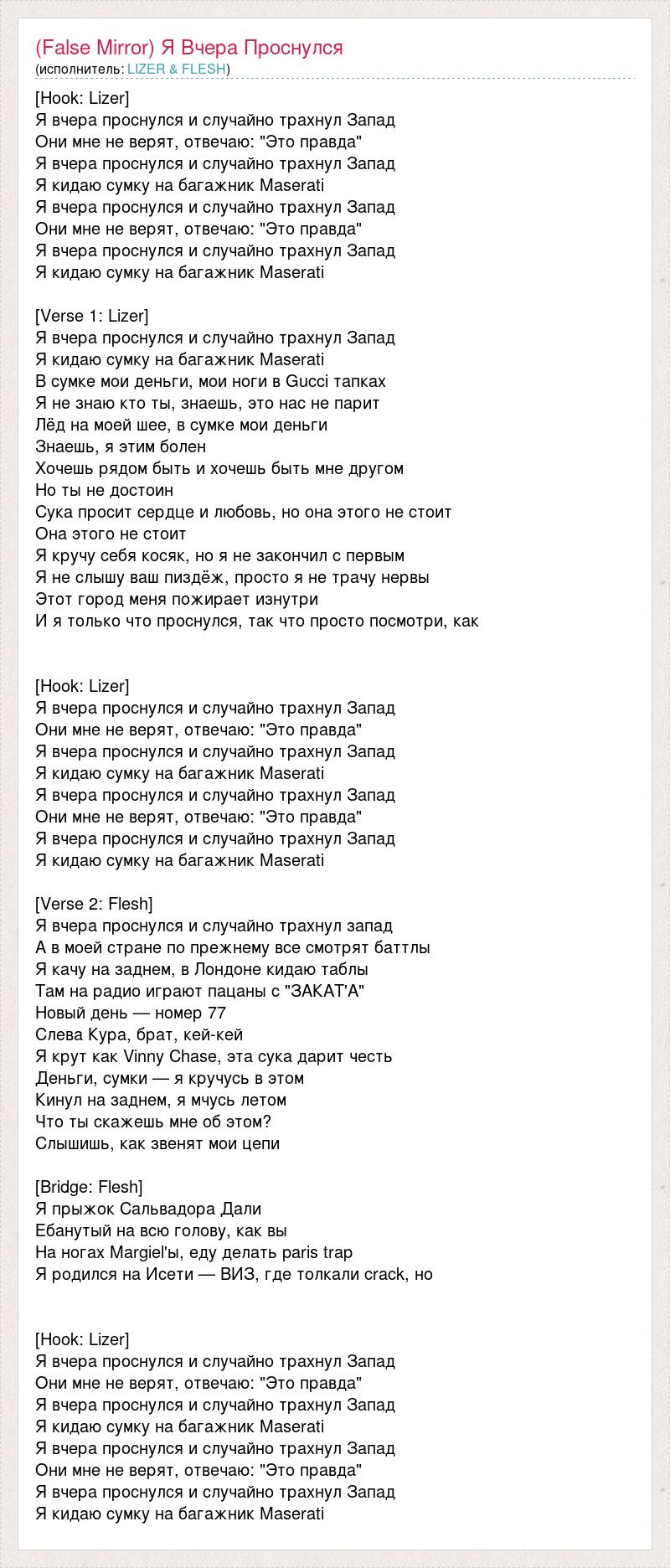 [Hook: Lizer] Я вчера проснулся и случайно трахнул Запад Они мне не верят, отвечаю: "Это правда" Я вчера проснулся и случайно трахнул Запад Я кидаю сумку на багажник Maserati Я вчера проснулся и случайно трахнул Запад Они мне не верят, отвечаю: "Это правда" Я вчера проснулся и случайно трахнул Запад Я кидаю сумку на багажник Maserati [Verse 1: Lizer] Я вчера проснулся и случайно трахнул Запад Я кидаю сумку на багажник Maserati В сумке мои деньги, мои ноги в Gucci тапках Я не знаю кто ты, знаешь, это нас не парит Лёд на моей шее, в сумке мои деньги Знаешь, я этим болен Хочешь рядом быть и хочешь быть мне другом Но ты не достоин Сука просит сердце и любовь, но она этого не стоит Она этого не стоит Я кручу себя косяк, но я не закончил с первым Я не слышу ваш пиздёж, просто я не трачу нервы Этот город меня пожирает изнутри И я только что проснулся, так что просто посмотри, как [Hook: Lizer] Я вчера проснулся и случайно трахнул Запад Они мне не верят, отвечаю: "Это правда" Я вчера проснулся и случайно трахнул Запад Я кидаю сумку на багажник Maserati Я вчера проснулся и случайно трахнул Запад Они мне не верят, отвечаю: "Это правда" Я вчера проснулся и случайно трахнул Запад Я кидаю сумку на багажник Maserati [Verse 2: Flesh] Я вчера проснулся и случайно трахнул запад А в моей стране по прежнему все смотрят баттлы Я качу на заднем, в Лондоне кидаю таблы Там на радио играют пацаны с "ЗАКАТ'А" Новый день — номер 77 Слева Кура, брат, кей-кей Я крут как Vinny Chase, эта сука дарит честь Деньги, сумки — я кручусь в этом Кинул на заднем, я мчусь летом Что ты скажешь мне об этом? Слышишь, как звенят мои цепи [Bridge: Flesh] Я прыжок Сальвадора Дали Ебанутый на всю голову, как вы На ногах Margiel'ы, еду делать paris trap Я родился на Исети — ВИЗ, где толкали crack, но [Hook: Lizer] Я вчера проснулся и случайно трахнул Запад Они мне не верят, отвечаю: "Это правда" Я вчера проснулся и случайно трахнул Запад Я кидаю сумку на багажник Maserati Я вчера проснулся и случайно трахнул Запад Они мне не верят, отвечаю: "Это правда" Я вчера проснулся и случайно трахнул Запад Я кидаю сумку на багажник Maserati