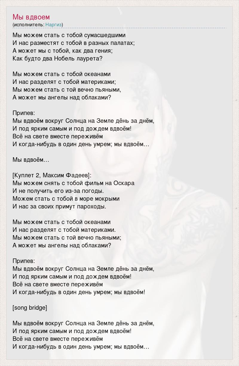 Мы можем стать с тобой сумасшедшими И нас разместят с тобой в разных палатах; А может мы с тобой, как два гения; Как будто два Нобель лаурета? Мы можем стать с тобой океанами И нас разделят с тобой материками; Мы можем стать с той вечно пьяными, А может мы ангелы над облаками? Припев: Мы вдвоём вокруг Солнца на Земле дёнь за днём, И под ярким самым и под дождем вдвоём! Всё на свете вместе переживём И когда-нибудь в один день умрем; мы вдвоём… Мы вдвоём… [Куплет 2, Максим Фадеев]: Мы можем снять с тобой фильм на Оскара И не получить его из-за погоды. Можем стать с тобой в море мокрыми И нас за своих примут пароходы. Мы можем стать с тобой океанами И нас разделят с тобой материками. Мы можем стать с той вечно пьяными; А может мы ангелы над облаками? Припев: Мы вдвоём вокруг Солнца на Земле дёнь за днём, И под ярким самым и под дождем вдвоём! Всё на свете вместе переживём И когда-нибудь в один день умрем; мы вдвоём! [song bridge] Мы вдвоём вокруг Солнца на Земле дёнь за днём, И под ярким самым и под дождем вдвоём! Всё на свете вместе переживём И когда-нибудь в один день умрем; мы вдвоём…