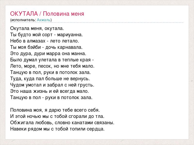 Окутала меня, окутала. Ты будто мой сорт - мариуанна. Небо в алмазах - лето летало. Ты моя бэйби - дочь карнавала. Это дура, дури марра она манна. Было думал улетала в теплые края - Лето, море, песок, но мне тебя мало. Танцую в пол, руки в потолок зала. Туда, куда пал больше не вернусь. Чудом умотал и забрал с ней грусть. Это наша жизнь и ей всегда мало. Танцую в пол - руки в потолок зала. Половина моя, я дарю тебе всего себя. И этой ночью мы с тобой сгорали до тла. Обжигала любовь, словно канатами связаны. Навеки рядом мы с тобой топили сердца.