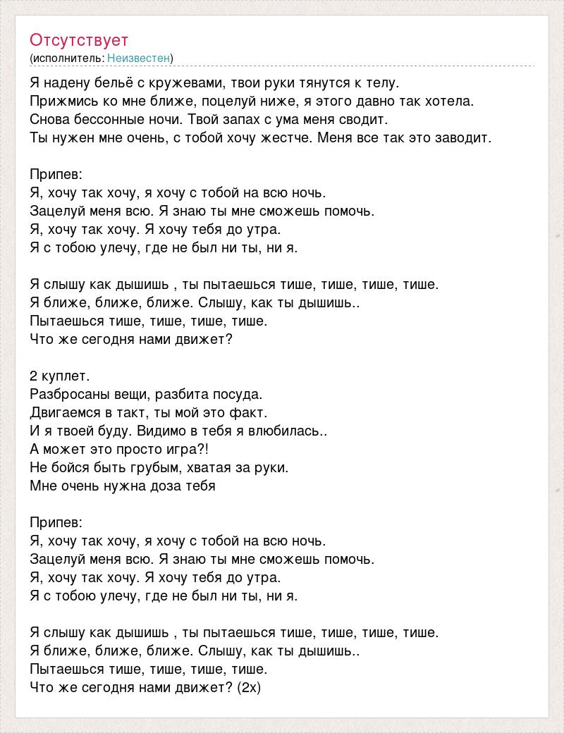 Я надену бельё с кружевами, твои руки тянутся к телу. Прижмись ко мне ближе, поцелуй ниже, я этого давно так хотела. Снова бессонные ночи. Твой запах с ума меня сводит. Ты нужен мне очень, с тобой хочу жестче. Меня все так это заводит. Припев: Я, хочу так хочу, я хочу с тобой на всю ночь. Зацелуй меня всю. Я знаю ты мне сможешь помочь. Я, хочу так хочу. Я хочу тебя до утра. Я с тобою улечу, где не был ни ты, ни я. Я слышу как дышишь , ты пытаешься тише, тише, тише, тише. Я ближе, ближе, ближе. Слышу, как ты дышишь.. Пытаешься тише, тише, тише, тише. Что же сегодня нами движет? 2 куплет. Разбросаны вещи, разбита посуда. Двигаемся в такт, ты мой это факт. И я твоей буду. Видимо в тебя я влюбилась.. А может это просто игра?! Не бойся быть грубым, хватая за руки. Мне очень нужна доза тебя Припев: Я, хочу так хочу, я хочу с тобой на всю ночь. Зацелуй меня всю. Я знаю ты мне сможешь помочь. Я, хочу так хочу. Я хочу тебя до утра. Я с тобою улечу, где не был ни ты, ни я. Я слышу как дышишь , ты пытаешься тише, тише, тише, тише. Я ближе, ближе, ближе. Слышу, как ты дышишь.. Пытаешься тише, тише, тише, тише. Что же сегодня нами движет? (2х)